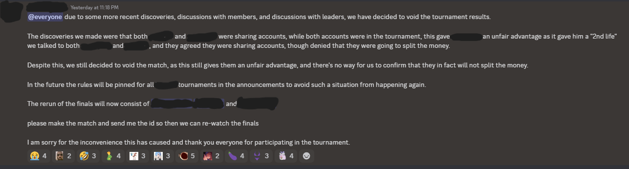 >>544154401If 2 dudes in a tourney are actual 1 guy with 2 accounts, he gets 2 tickets to compete.
