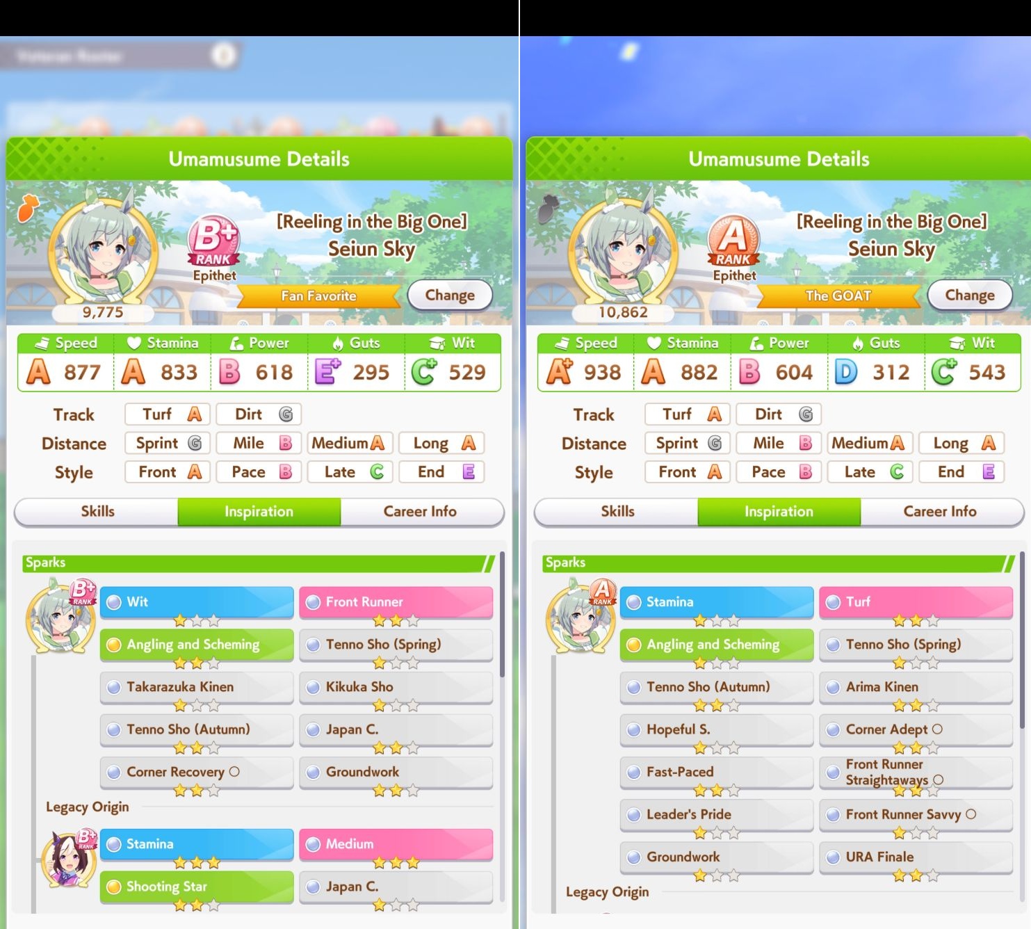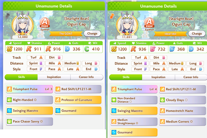 >>544176795You still have a few days to make something better (preferable with SFV as well) but I'd carrot left and use her 100%.Better wit gives you more chances to actually activate the few skills you have and power will help you pull ahead. where as right you're praying that your Oguri is smart enough to actually find the track