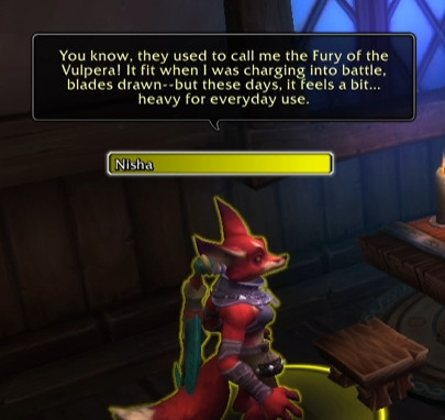 Some moody fucking elf who's just going to whine and disparage the player whilst harping on about how trivial material possessions are and how mysterious and forlorn her true motives are or some shit (She's just red Alleria)