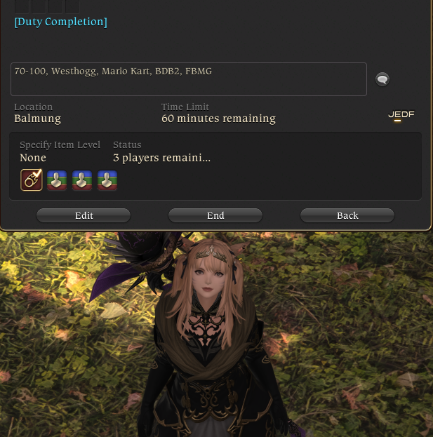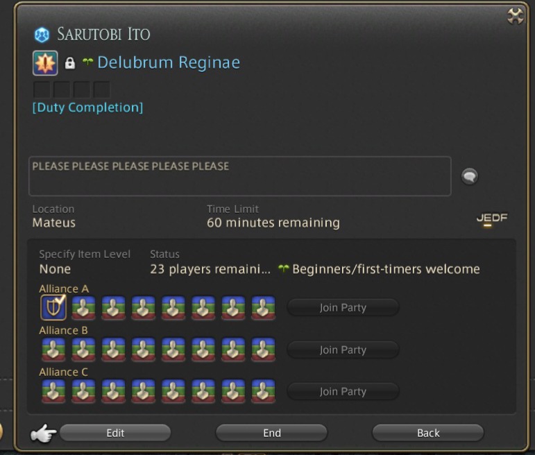 >join "70-100 fast clear" pf>spend the next 2 hours dragging three corpses all the way to the finish line>they all die to in/out mechanics>they all step on luring traps>they all waste pomanders>I had to solo the final boss because they all died by the third mechanicSoloing was easier.