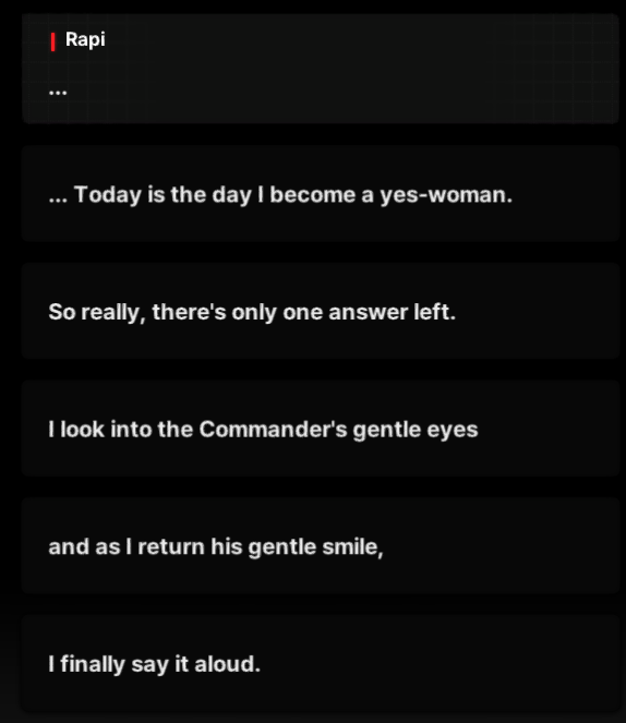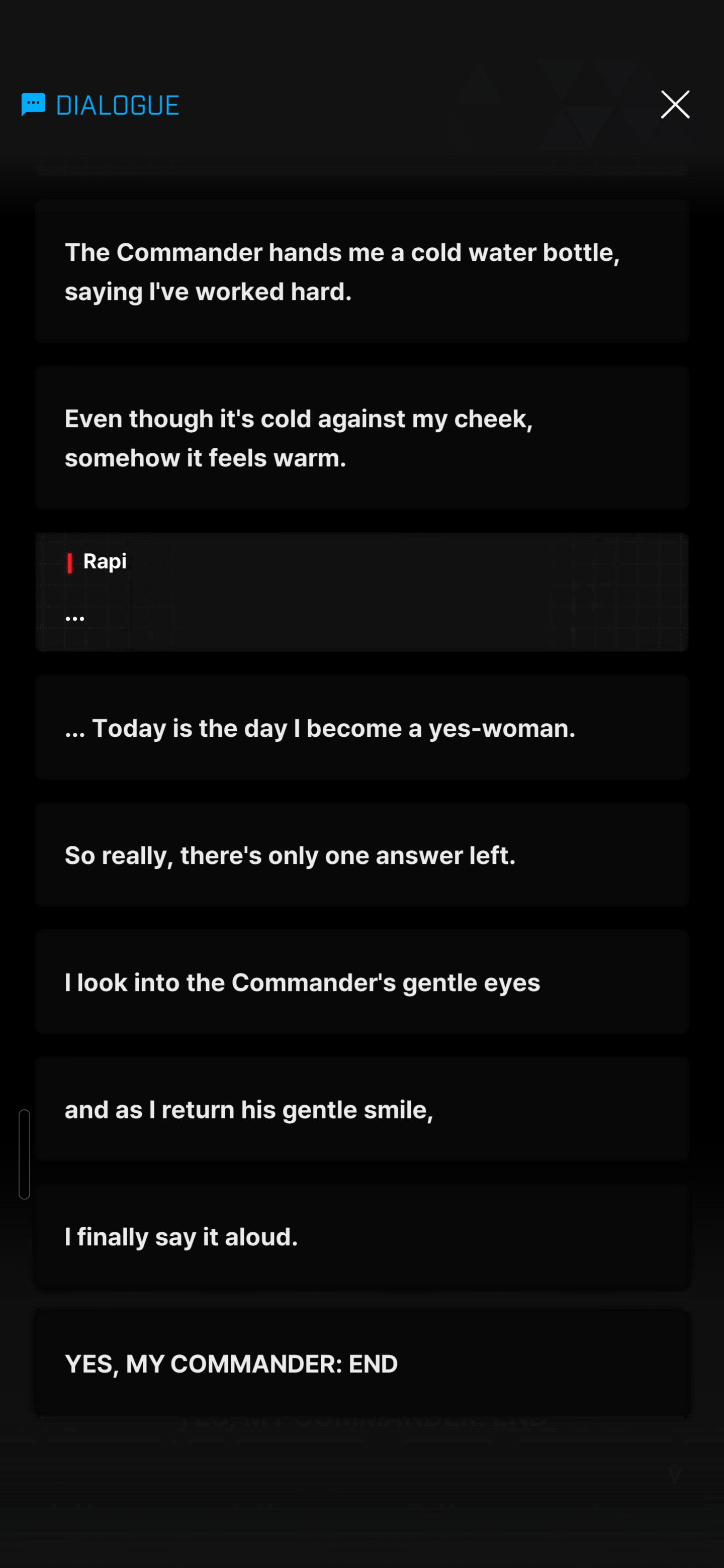 >>544214561IMO, she did say "YES, MY COMMANDER". It would be silly to repeat it twice.>Yes, My Commander>YES, MY COMMANDER; ENDIn any case, it is implied that she says some variation of it>I finally say it aloudThat being said, she says yes to Commander's advice to take a rest.