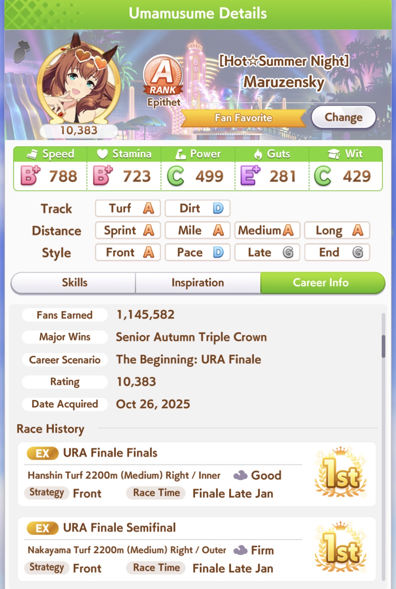 Previous: >>544182886>Global Game NewsCurrent Rate Up: Meisho Doto (3*), Summer Maruzensky (Alt 3*), Summer Special Week (Alt 3*), Special Week (SSR), Tokai Teio (SSR), Sweep Tosho (SSR), Winning Ticket (SSR)10/14 - Summer Story event10/26 - Half Anniversary Part 110/30 - Eishin Flash (3*), Nice Nature (SSR), Tosen Jordan (SR)10/30 - LEO CUP - Hanshin 2200m>JP Game NewsCurrent Rate Up: Dantsu Flame (3*), Jungle Pocket (3* Rerun)>New Uma: Red Desire (VA: Sekine Hitomi)Timeline: https://uma.moe/timeline>IP NewsUmamusume Cinderella Gray 2nd season started weekly airings on 10/5Umamusume 6th Live Event Autumn Leg will be held on 10/18-19Guest Starring:Alexandros, Ooishi Masayoshi (Day 1), Kageyama Hironobu (Day 2)https://umamusume.jp/contents/event/tnf6th-autumn/>Thread Clubshttps://rentry.org/globalclubsumaYou must be E3 (20k points) to join a circle. Apply with /uma/ or /vg/ in your profile or post ID in the thread.>All Guides & Resourceshttps://rentry.org/uma26Game databasehttps://gametora.com/umamusume (Click the gear to switch between JP / global server info)A basic guide for newfagshttps://rentry.org/umaglobalFind networks if your region is blocked from the game or clienthttps://www.umavpn.top/93Seiyuu & Concertshttps://rentry.org/umst/uma/ POG (Paper Owners Game)https://rentry.org/umapog