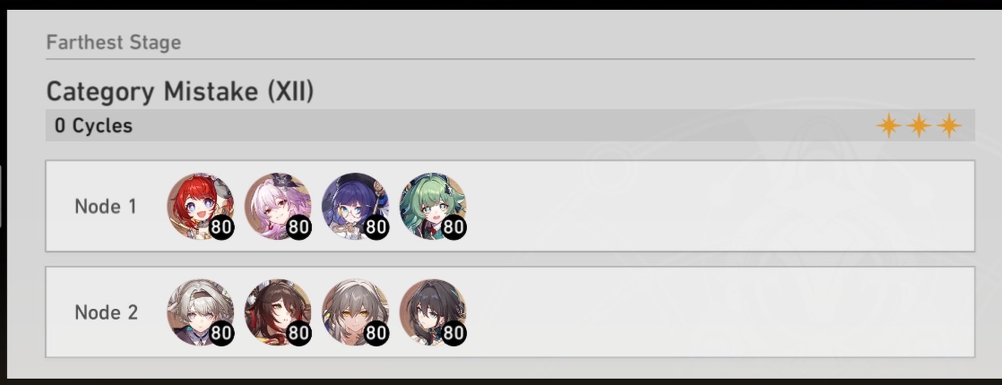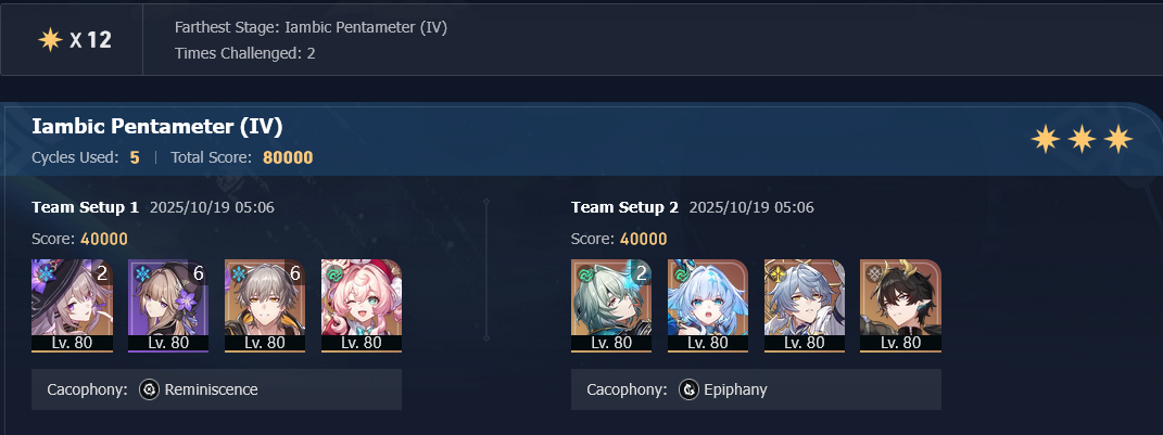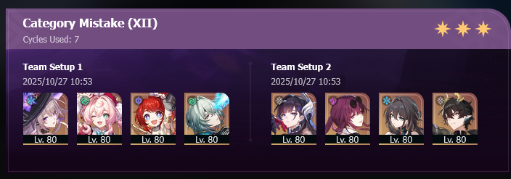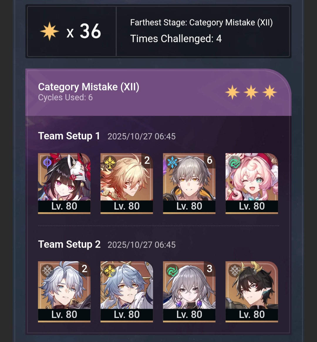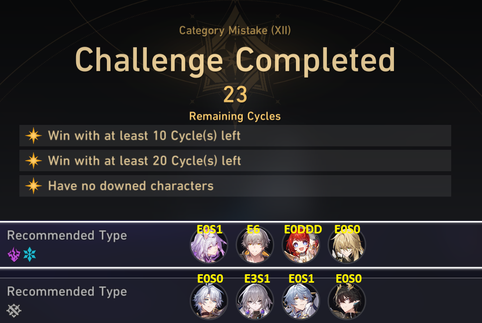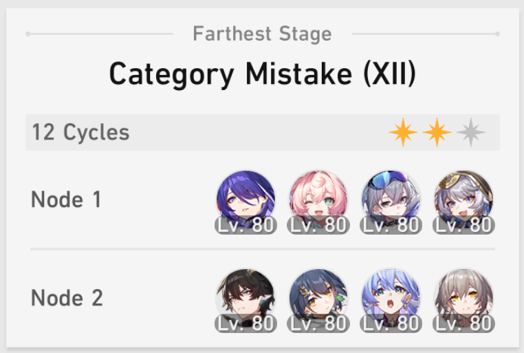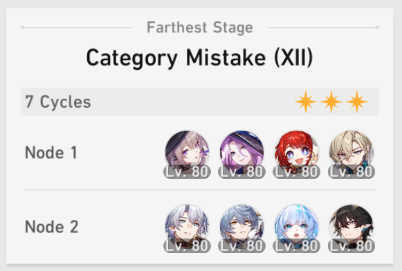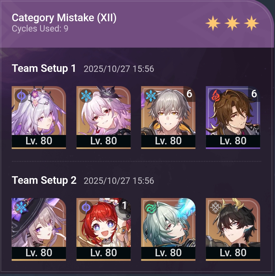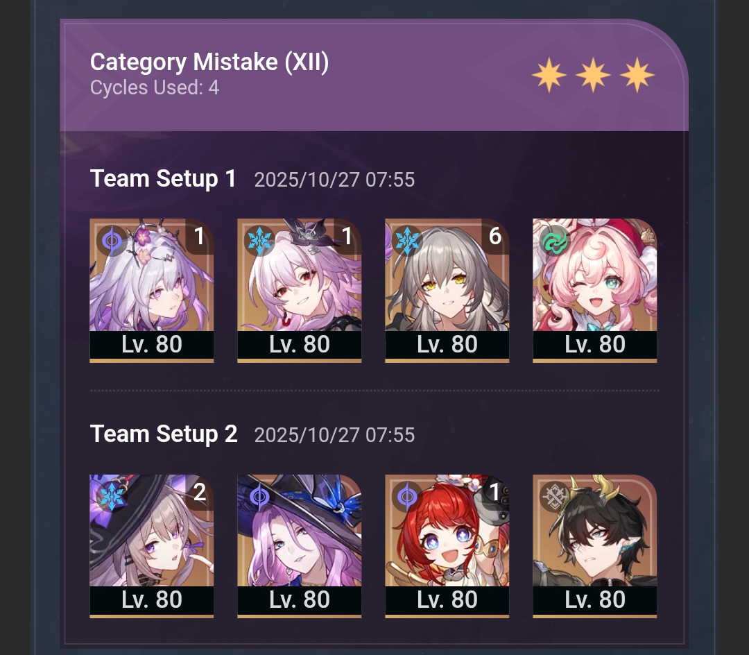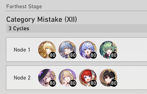 My F2P Tribbie+RMC-powered Castorice with Gallagher did the first stage in 5 cycles and then Phainon wiped the second in 2. Teambuild better.