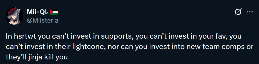 HSR has the worst character building I've ever seen and experienced out of the 3 modern Hoyo titles. It should not be this hard to farm the right relics. Not even ZZZ or Genshin is this bef
