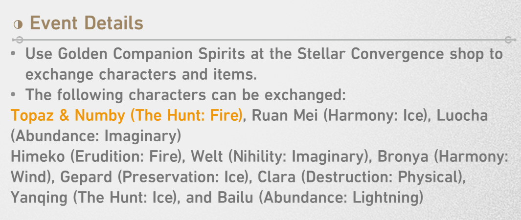 >Current Character Banners: Dan Heng • Permansor Terrae, Anaxa + Sushang, Hanya, Serval - https://www.hoyolab.com/article/41743443