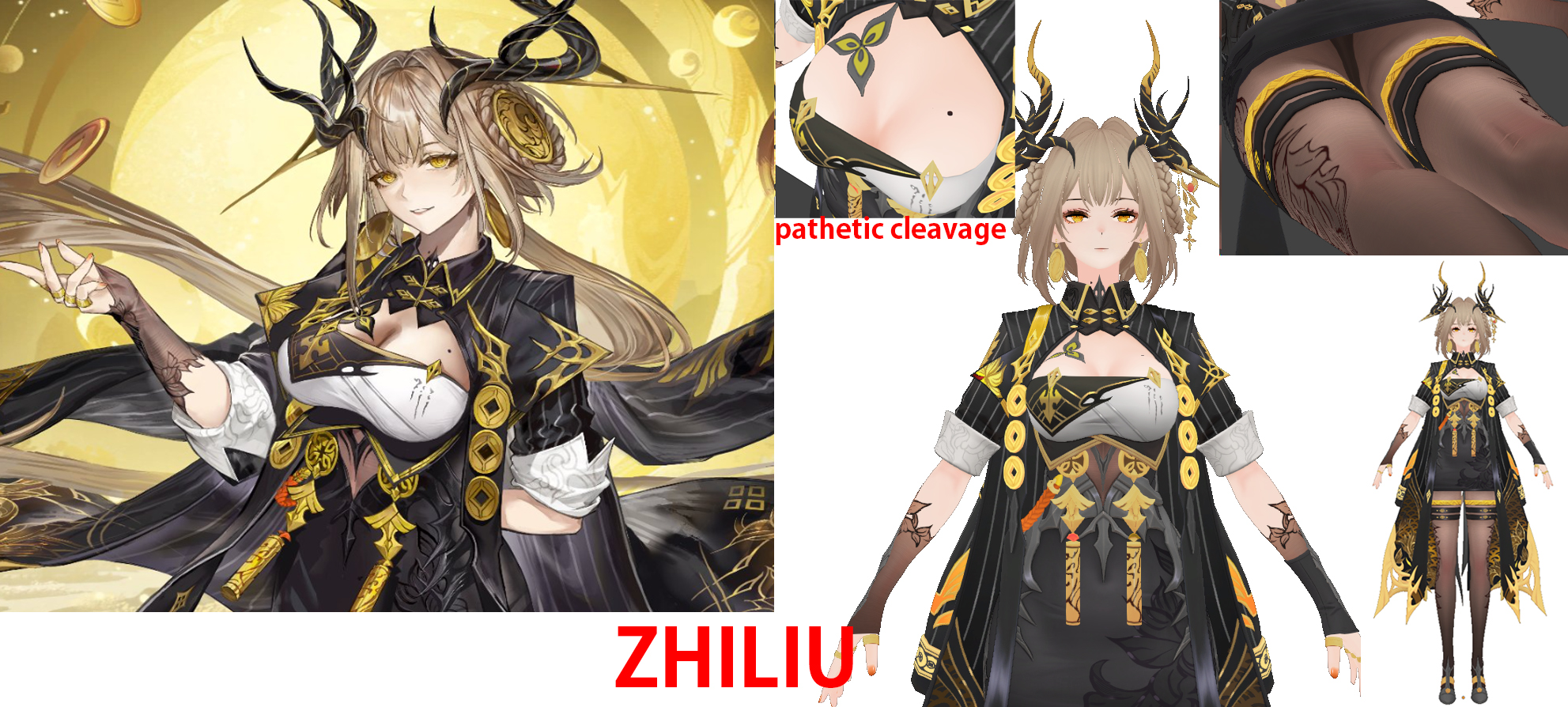 >>544256901>bad lightingBad lightning doesn't make a character's forheard 5 times larger (look how much lower set her eyes are ingame vs the splash art), or their skin color completely change (she has greyish skin in the splash art, yet is brown ingame. And no lightning, at least not that particular lighting, wouldn't explain such a dramatic change in color hue), or their boobs dissappear, or the textures to be extremely low resolution. The character models are just completley fucking incompetent and probably all unpaid interns or they outsourced the models to a jeet studio.Here's what an actual quality model looks like.