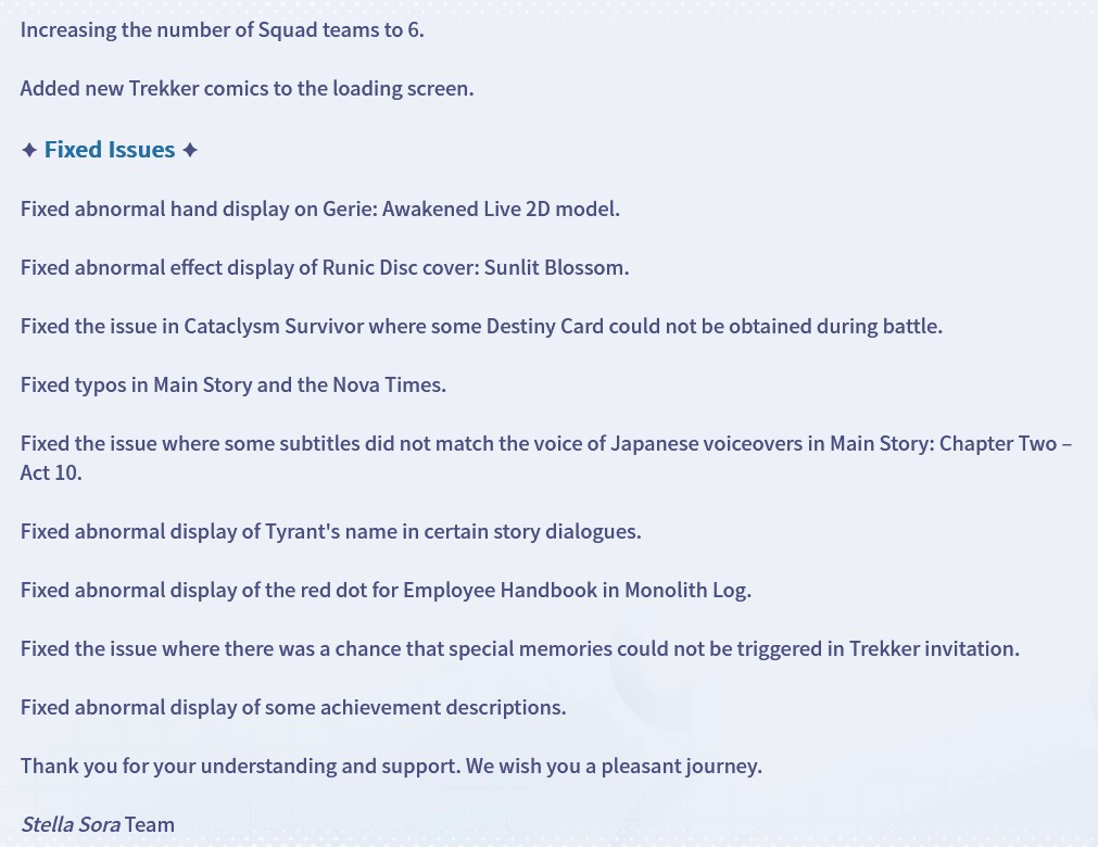 Previous Commission:>>544237792>NEWS:Upcoming Event PVhttps://www.youtube.com/watch?v=5J98rb790VQSatisfaction and Feedback SurveyCheck your In-Game mail - Reward 150 gems>Game Website & Downloadhttps://stellasora.global/>JP Clienthttps://stellasora.jp/>Current Content[10/19-11/10] Limited Recruit - (Aqua) Chitose 5* + (Lux) Jinglin 4* and (Aqua) Teresa 4*[10/19-11/10] Disc Pickup - 5* (Aqua) "Sword Against Stream">Upcoming Content[10/27-11/27] Login Event - Wind, Wave, Wild Adventure[10/27-11/17] Limited Recruit - (Lux) 5* Shia + (Lux) Tilia 4* and (Ignis) Kasimira[10/27-11/17] Disc Pickup - (Lux) 5* "Ripples of Nostalgia"[10/27-11/17] Limited Event - Daring adventure! The Ghost Ship Haunts the Deep[10/27-11/17] Paid Skin - Noya[10/27-11/17] Cataclysm Survivor - Catastrophe (Element: Lux+Aqua+Ventus)[10/27-11/17] A Finale Echoing (Element: None)[10/27-11/17] Menace Gala - All Elemental Arena Open[11/10] New Nova Times Chapters[11/17] Main Story Chapter 3 Release>Pre-Release Infohttps://rentry.co/PreReleaseSoraInfo>Day 1 Tierlisthttps://game8.jp/stellasora/729763>/sora/ Friendlisthttps://pastebin.com/sXhz2LgD>L2D Galleryhttps://srpg-kr.github.io/live2d/stellarsora/>CodesBOSSGIFT