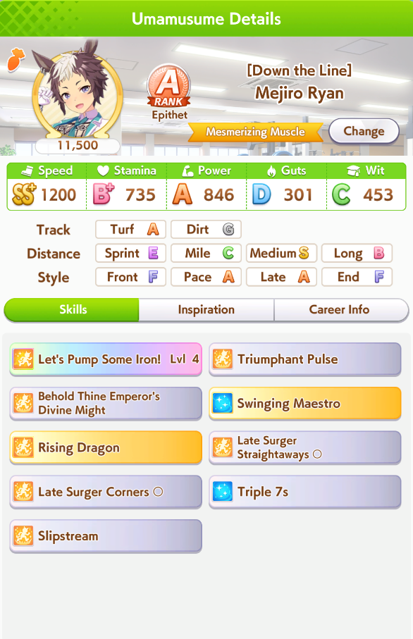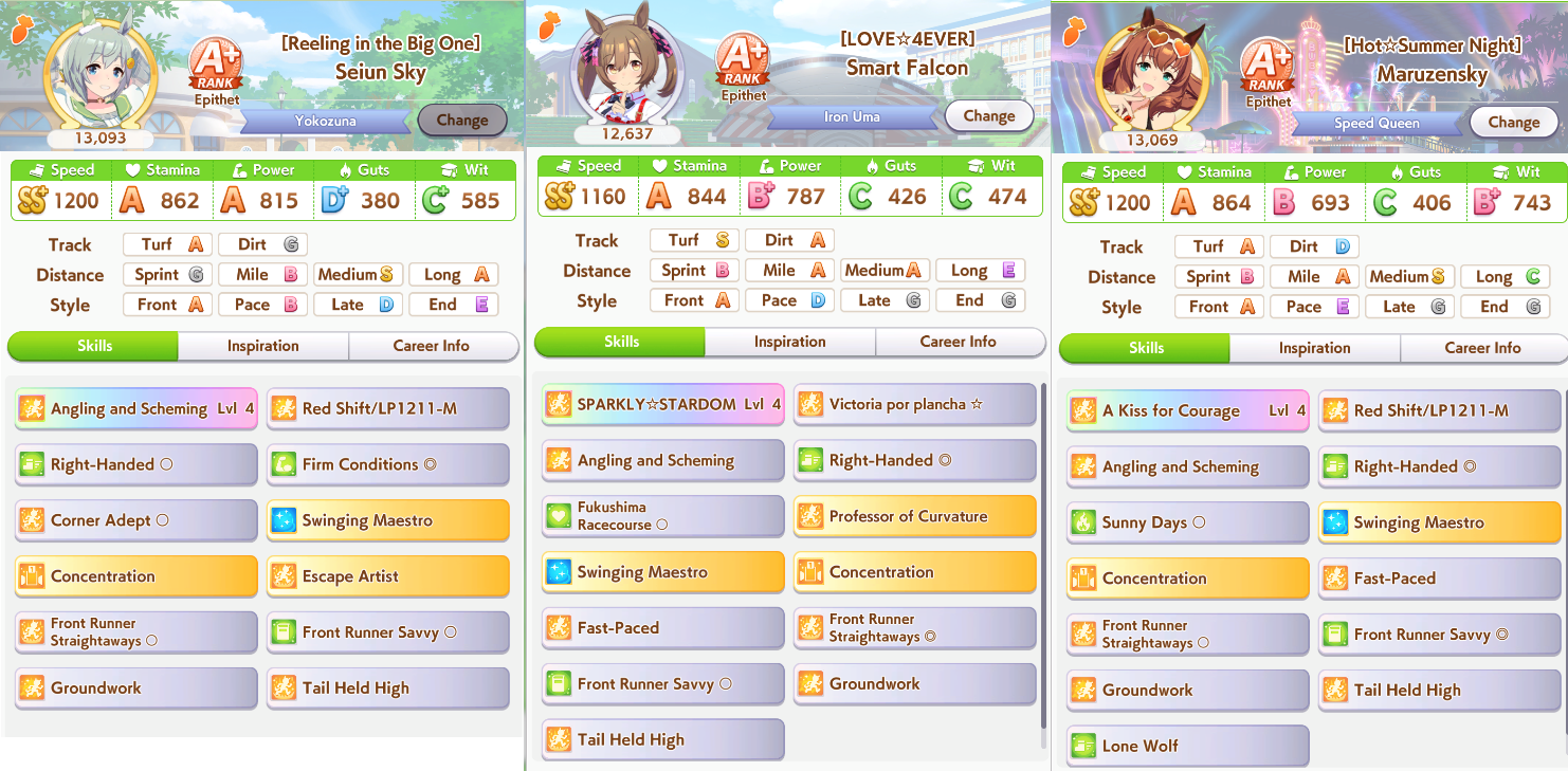 >>544312464>I'm just borrowing a decent Taiki parent for her unique, with decent stam spark and medium sparks.If you're a masochist, you can gamble on 3 green redshift though the availability of stamina Taiki+Maru is very limited.https://chronogenesis.net/friend_search?green_list=10040103&blue_count=9&stamina_legacy=3&factor_id_array=10100101|10100102|10100103If you have a good maruzensky parent (you're a newfag so probably not), use yours - otherwise figure out how to use the compatibility calculator and the databases to find a good enough borrow.