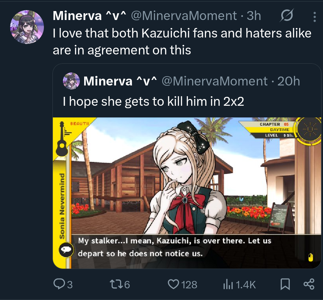 Previous thread >>544087262 Reminder to report and ignore shitposters>/drg/ OP pastebin (just copy it and paste previous thread link)https://pastebin.com/0ZZ0PBVq >Danganronpa News, Interviews and ArticlesLatest: Danganronpa 2x2 coming in 2026https://store.steampowered.com/app/3751230/Danganronpa_2x2/ Famitsu Article for Danganronpa 2x2 on September 15, 2025https://www.famitsu.com/article/202509/52362 Old news updated 23/7/22: https://pastebin.com/pnwKUj3d >/drg/'s spoiler-free guide for the series *MUST READ IF YOU ARE NEW*https://pastebin.com/e4vAtW9j >Game links *contains links to official store pages for each game*https://pastebin.com/BHMqjseg >Download pastebin *contains DOWNLOADS "wink", art assets, sprites, manga, novels, music, anime, media, charts, and icons.*https://pastebin.com/6yDzsSsd >/drg/ resources: *contains links to ship tags, modding tools/guides, fanart, fics, and dr-related artists*https://pastebin.com/AN2kqff1 >in the event of pastebin getting nukedhttps://mega.nz/folder/kRsBlSTZ#sGtlSJIjUaSbpvNv4UsO6w