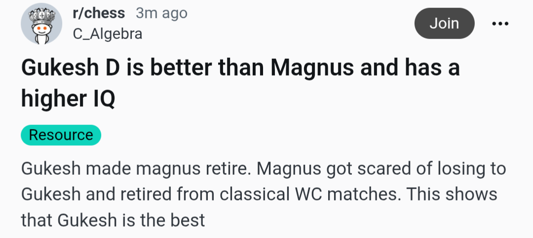 >>544283514>weakmindI know this is a meme but intelligence isn't enough for a sport like this. He's too timid and overthinking. His attitude is actually causing him objective issues. Magnus is very intelligent but he's gives off more intuitive talent vibes than Ding who seems more a thinker, he doubts himself too much. Meanwhile Magnus stated before that he almost immediately has an instinctive knowledge of the next move and his "calculation" is just him checking if his instinct is right and if he missed anything. I think this is the right way instead of being overtly cautious.