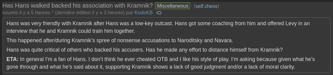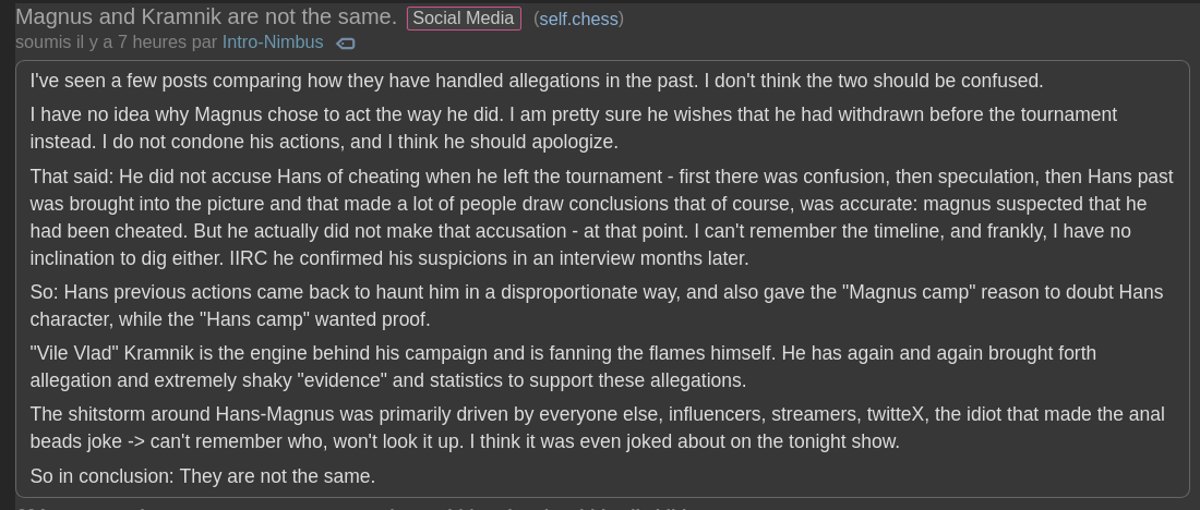 >>544496123Actually it starts going as soon as he starts talking after the timestamp here >>544493723These things are subtle because he's actually a very convincing person since he's so intelligent and can string together narratives so well and can also change the facts conveniently. So the point is that he doesn't want to talk about the facts, but instead makes irrelevant points or says how offended he is or how stupid Kramnik is. It's always that kind of thing at all times for everything. Of course this is all in hindsight now that he's gone and I've been paying attention. I wouldn't be able to confirm that he's dishonest just watching this video by itself.