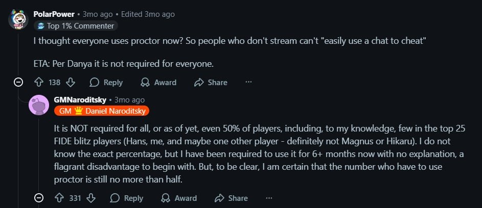 >>544445869I can’t stop thinking about what happened to Danya, how the selective proctoring and unfair treatment he faced .Danya was required to play in TT events under proctoring for quite some time, something that most other players didn’t do. That alone raises serious questions about consistency and fairness in how he was treated by chesscom. He was later removed from TT after for not switching his chat to emote only mode, which raised speculations about him cheating.Danya talked openly online about how stressful the whole situation was for him. He repeatedly defended himself, but it was clear the constant scrutiny took a real emotional toll. For someone who gave so much to the game through his teaching, streaming, commentary, and genuine love for chess he deserved far more support and understanding than he got. chesscom never made a statement explaining why proctoring was used only for him. Danya’s experience shows just how much these issues matter.With Kramnik’s accusations and Danya being proctored, it’s heartbreaking to think how isolated and unfairly treated he must’ve felt. It made it look like he was under suspicion for the very allegations circulating around him. No player deserves that kind of pressure. Either everyone should be proctored or no one should, this sort of selective proctoring is purely evil and goes against everything fairness in chess should stand for.
