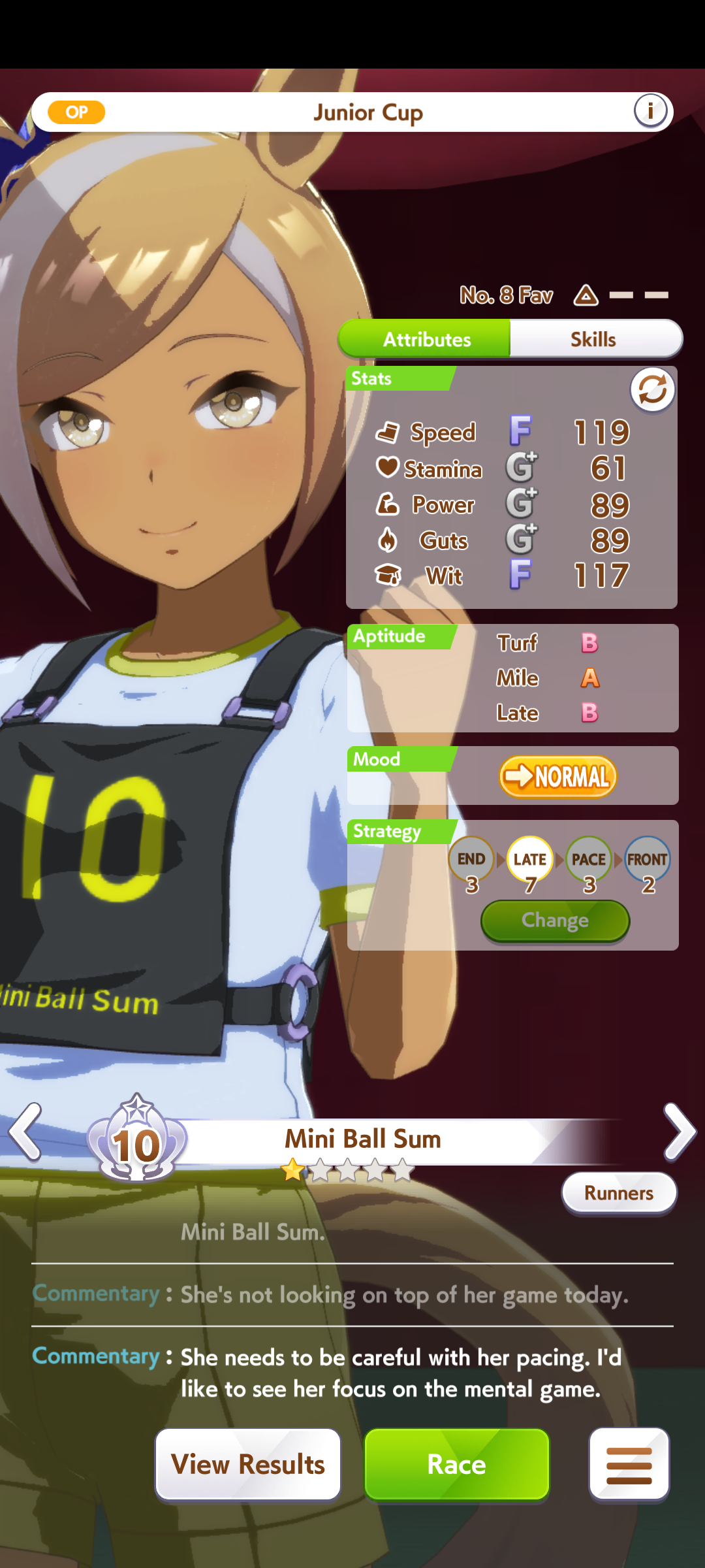 >>544367870Knowledge can't really help you, you either gimp her with useless red sparks, or you run a high risk of her just deciding to half of her races because she's only good at mediums