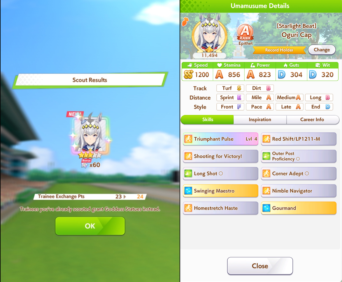 >>544367715I just had Bourbon lose Senior Japan Cup for the first time, despite having a million skills and S medium.After a whole career of>losing EVERY Mile and Long>losing 2 night owls, slacker, migraine>3 sleep deprived, 0 well rested>ONLY ONE SINGLE DOUBLE RAINBOW ON SPEED (with 4 speed cards)I think she just fucking hates me now
