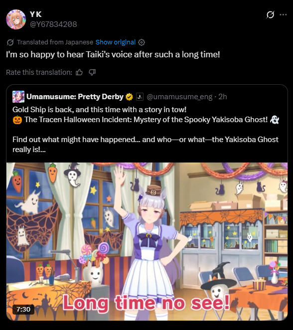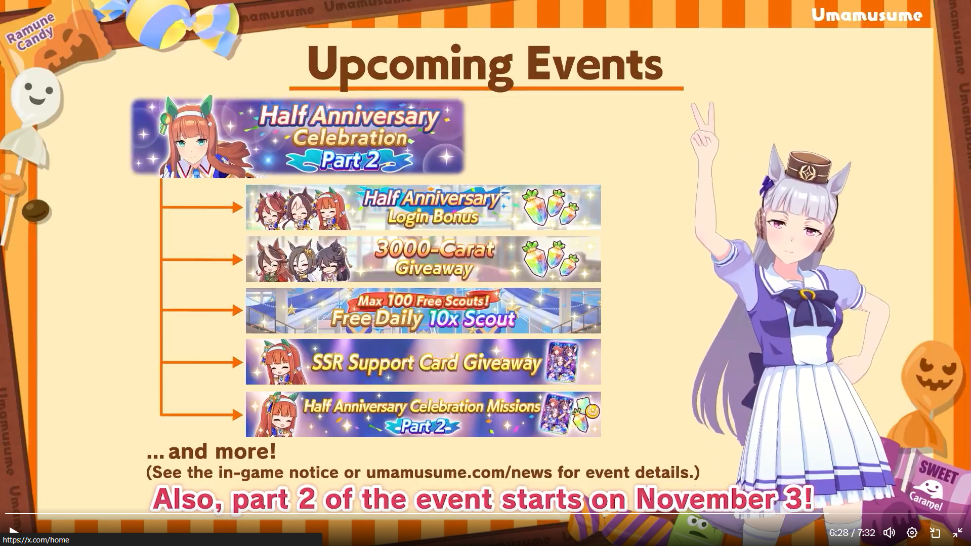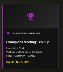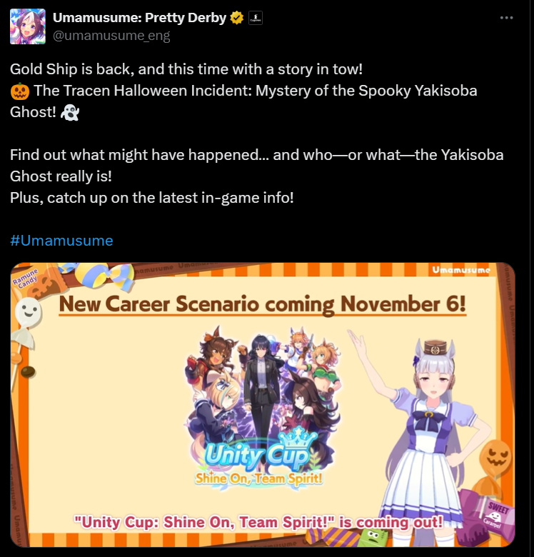 Previous: >>544265218 >Global Game NewsCurrent Specials Missions: Half Anniversary Part 1Current Rate Up: Meisho Doto (3*), Special Week (SSR), Tokai Teio (SSR)10/26 - Half Anniversary Part 110/30 - Eishin Flash (3*), Nice Nature (SSR), Tosen Jordan (SR)10/30 - LEO CUP - Hanshin 2200m11/02 - Half Anniversary Part 211/06 - Half Anniversary Part 3>JP Game NewsCurrent Rate Up: Dantsu Flame (3*), Jungle Pocket (3* Rerun)>New Uma: Red Desire (VA: Sekine Hitomi)Timeline: https://uma.moe/timeline>IP NewsUmamusume Cinderella Gray 2nd season started weekly airings on 10/5Umamusume 6th Live Event Autumn Leg will be held on 10/18-19Guest Starring:Alexandros, Ooishi Masayoshi (Day 1), Kageyama Hironobu (Day 2)https://umamusume.jp/contents/event/tnf6th-autumn/>Thread Clubshttps://rentry.org/globalclubsumaYou must be E3 (20k points) to join a circle. Apply with /uma/ or /vg/ in your profile or post ID in the thread.>All Guides & Resourceshttps://rentry.org/uma26Game databasehttps://gametora.com/umamusume (Click the gear to switch between JP / global server info)A basic guide for newfagshttps://rentry.org/umaglobalFind networks if your region is blocked from the game or clienthttps://www.umavpn.top/93Seiyuu & Concertshttps://rentry.org/umst/uma/ POG (Paper Owners Game)https://rentry.org/umapog