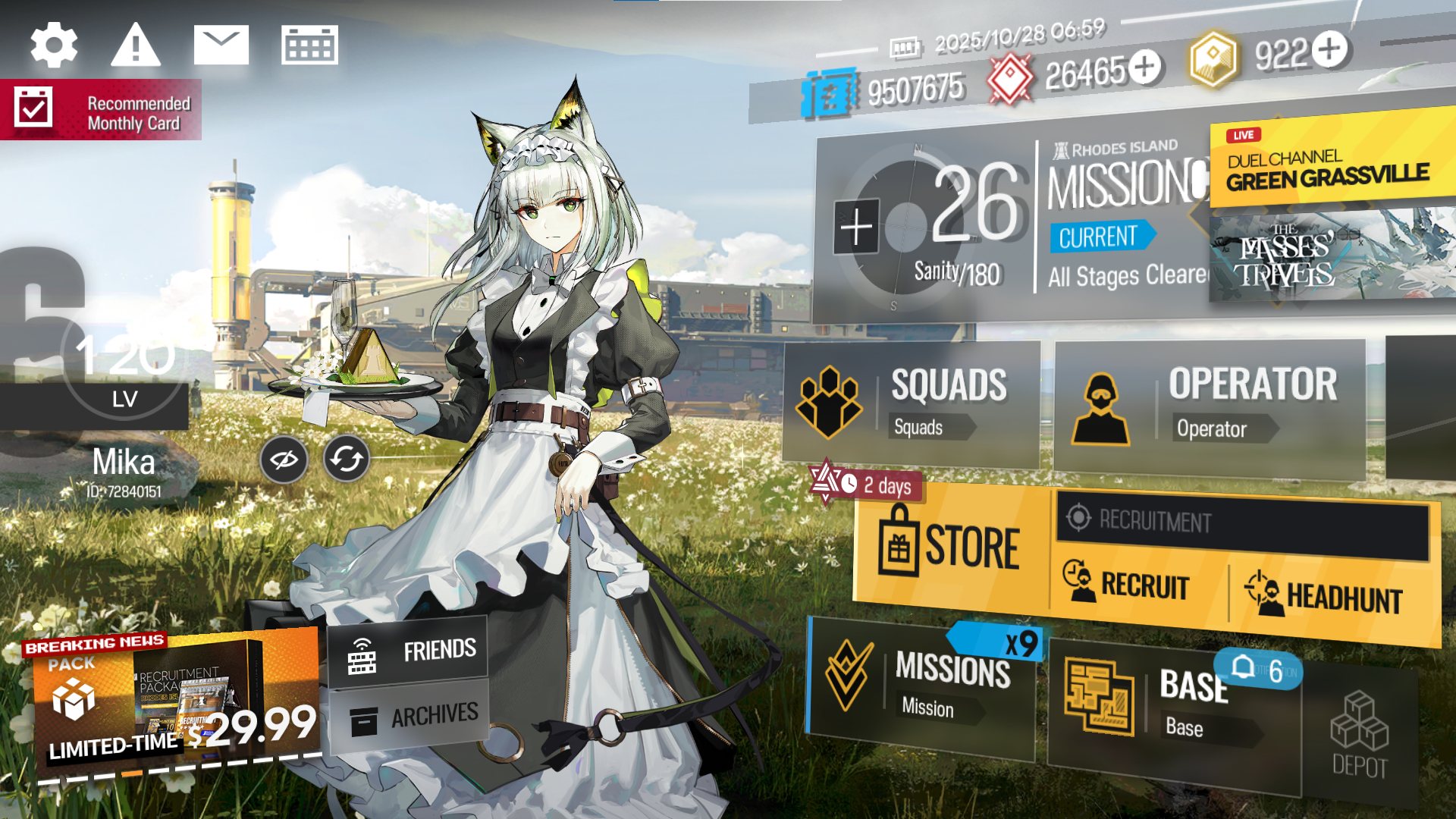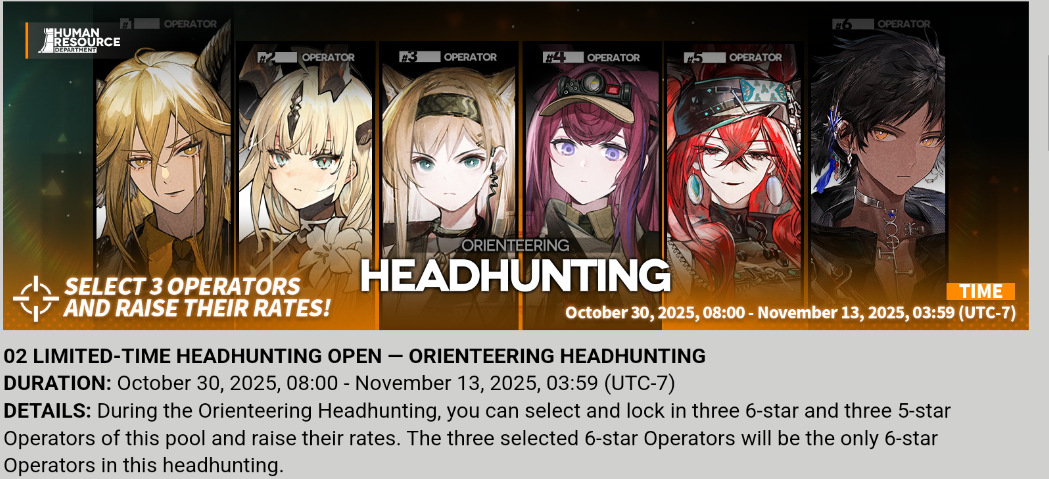 [11/14-11/28][Orienteering Headhunting]6* Guard Ulpianus, 6* Supporter Tragodia, 6* Supporter Stainless, 6* Sniper Narantuya, 6* Caster Nymph, 6* Guard Młynar, 5* Vanguard Mitm, 5* Guard Gracebearer, 5* Vanguard Poncirus, 5* Defender Bassline, 5* Medic Hibiscus The Purifier, 5* Caster Aroma