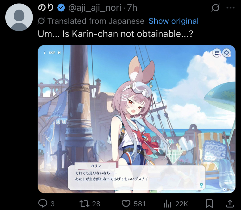 I went to check Japanese Twitter to see how the japanese are reacting to the new event>the Event is being discussed in a positive manner>the japanese are obsessed with Karin and want her as a playable character >doomposting is almost non-existent and the only complaints is about the $5 monthly and the BP not having an actual Skin like Summer Noya>more and more fanart is starting to appear>revenue ranking jumped from bottom 100 to top 10 or 20 in the last few hours in some JP websites>merch has sold very well in the Yostar JP store and several items are gone for good>whales stopped sleeping are spending now>seen tons of maxed Chitose and maxed Shia Did this fucking game managed to un-doom itself?