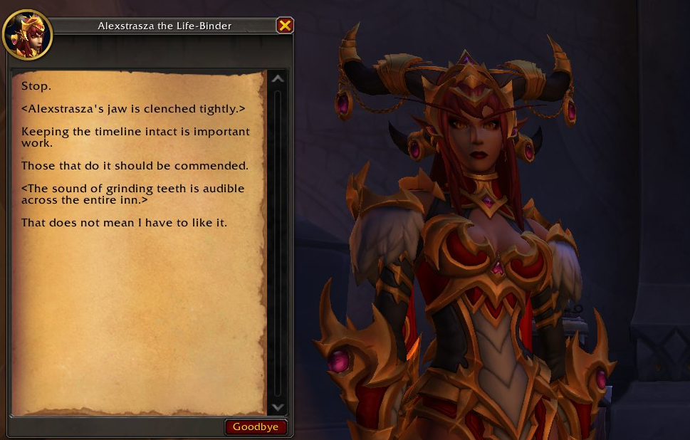 >>544426431This quest would have been fine if it was a grim commentary on how they have to keep all the most heinous parts of time intact, but instead it was Chromie making cheese jokes the entire timeAlso this whole patch's commentary being that it's okay to change time if you feel like it because feelings are all that matter