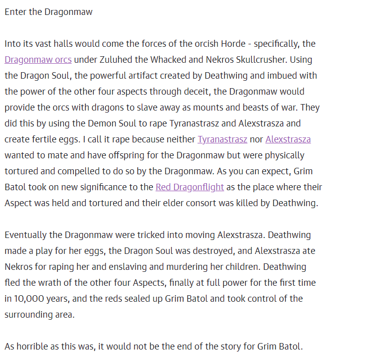 >>544427637>I call it rape because neither Tyranastrasz nor Alexstrasza wanted to mateif both of them were forced, who raped whom?if they really didn't want to produce offspring for the dragonmaw, they would've just chosen deaththe sex act itself wasn't rape, since they were mates anywayit's just that their children were stolen and used