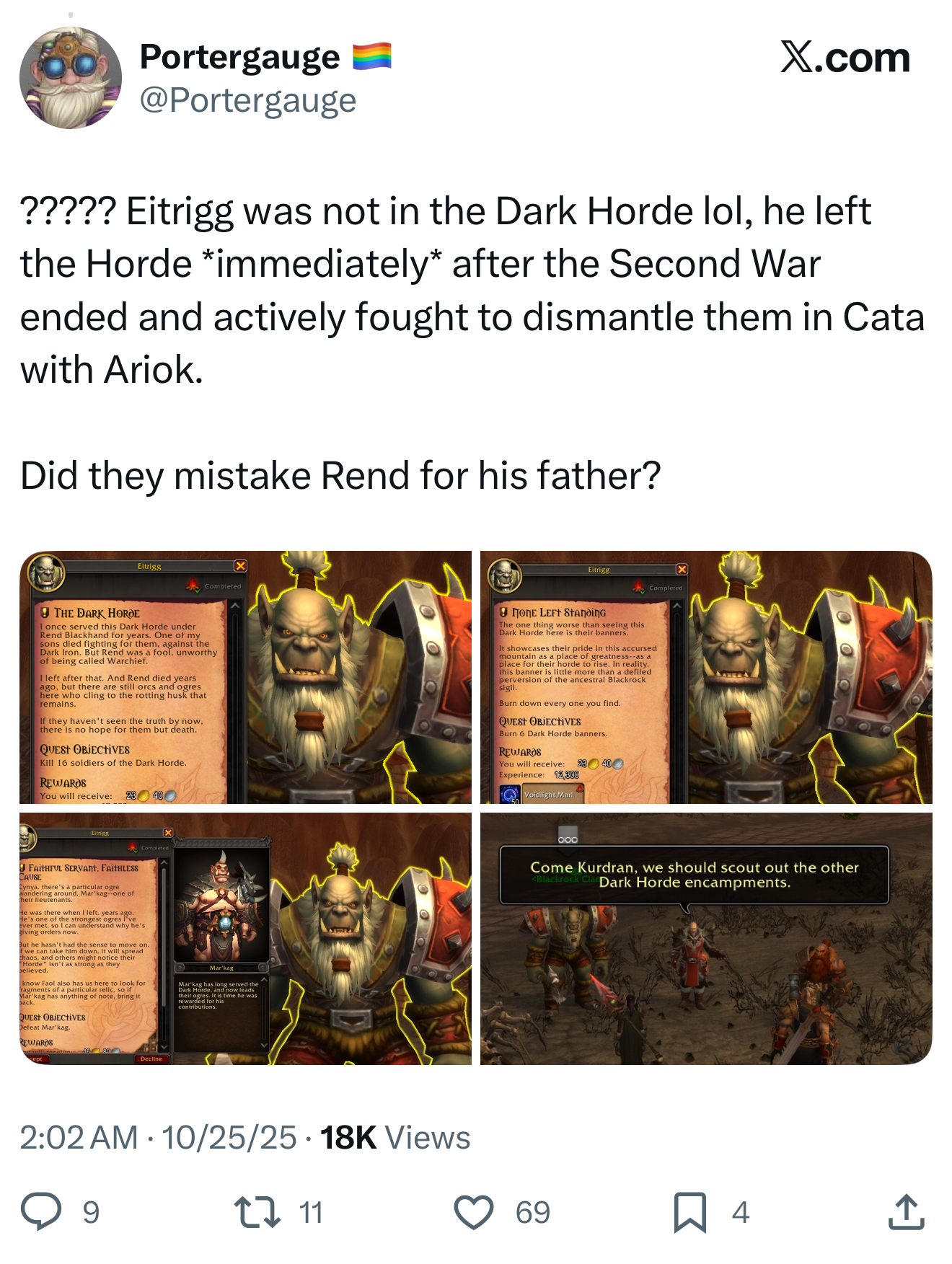 >>544461130>Sylvannas burnt down a whole tree/city, murdered women and children and made the defenders look>This is ok, she didn't really meant it and is now redeemed>Xal'atath exploded a whole city killing hundreds if not thousands and terrorized Khaz Algar >Was the cause of the destruction of the Voidfuck's homeworld>Betrays us and kills one of our allies and steals the super secret sauce in a rug pull>This is ok, she didn't really meant it and the ends justify the meansModern leftoid writing needs to cease altogether. We need stories were good and evil are clearly defined again