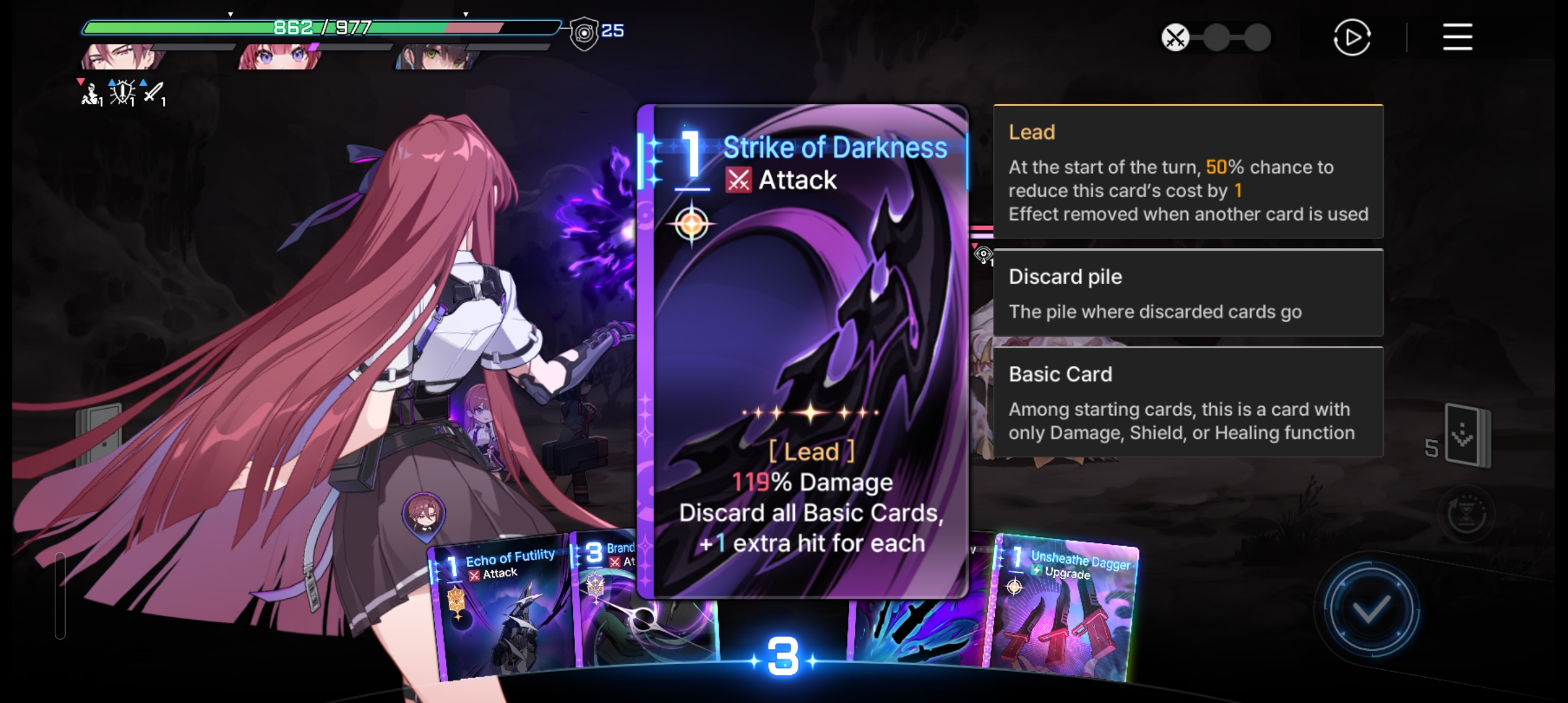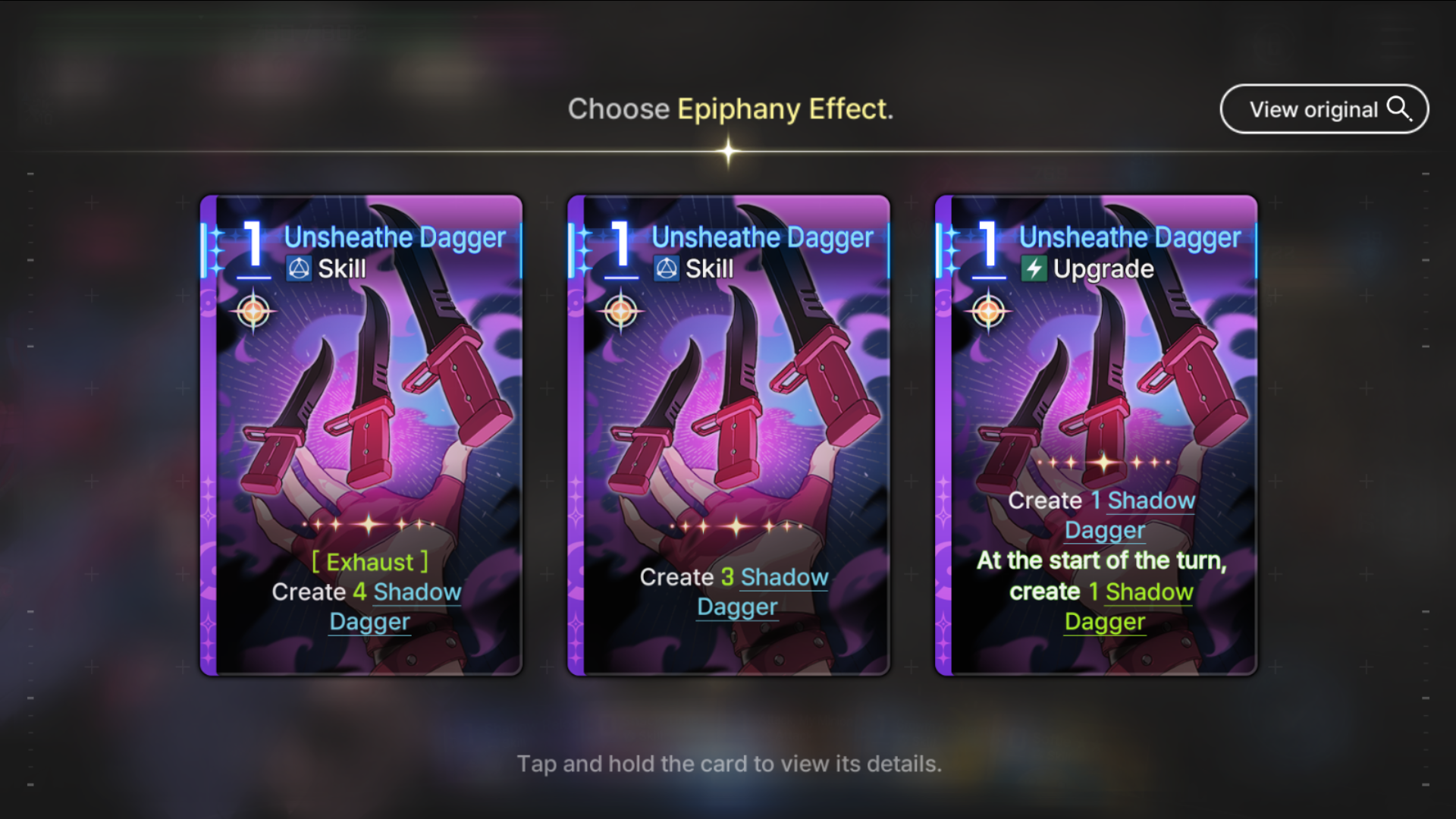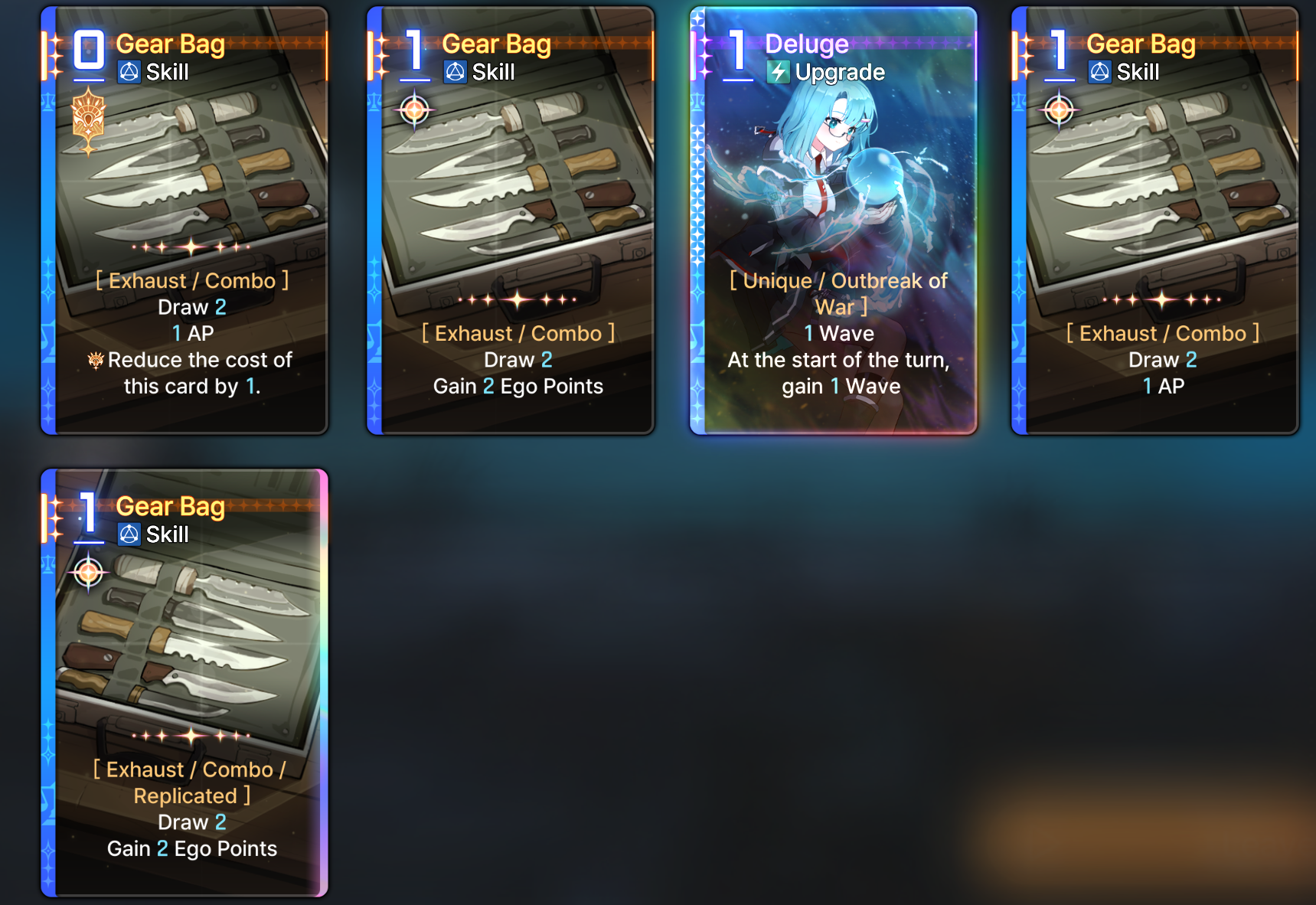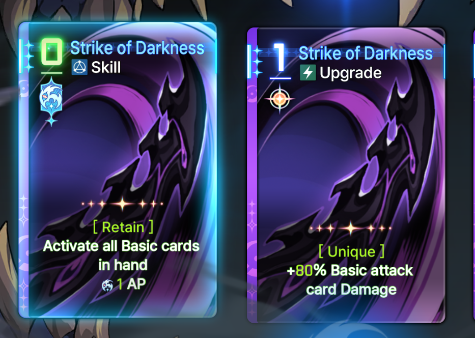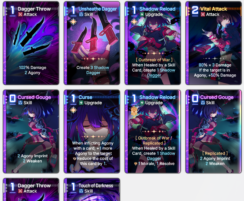 >apply 2 Agony to all enemies at the start of every turn sound stupid good what's the catch? >oh there is none - it's an Outbreak of War card too>thought this Tressa upgrade that generates a dagger on heal only applied to other teammates heals>it applies even to her own>thought it only worked once a turn>there's no limit>thought upgrades only applied once even when duped and duping just made it easier to draw it to activate>duping upgrade cards DOES double the effect>get two shadow daggers for free every heal>also doing extra agony because of a monster card drop>also dealing +40% damage on every dagger because of some mythic equipmentThis is actually retarded. I am even more retarded for now wanting to refine it by fishing for morale boosts on Mika or some shit.