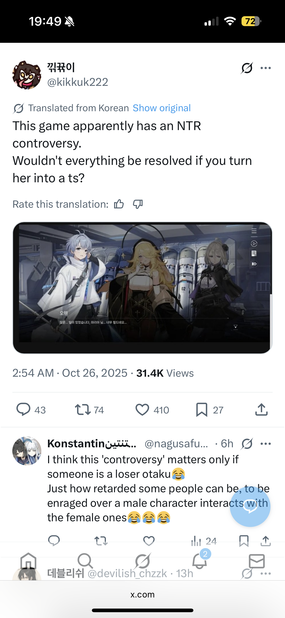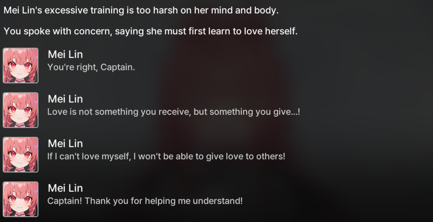 Man, I'm all for this game's gameplay and features and I'm going to keep playing but holy shit they fucking SUCK at pandering if that's what they're trying to do. You just constantly get shit like this or Mei lin talking to you about how she can cope that she can't see the people she loves anymore and how she should cope with that as if you have anything to do with it. Writers are actual dumbfucks if they're trying to make the player actually love these characters, I don't give a fuck about what they think about other people or how Maribell is a fucking slut that hugs her squadmates, these relationship stories should go into SoL details about the characters themselves not who they have relationships with