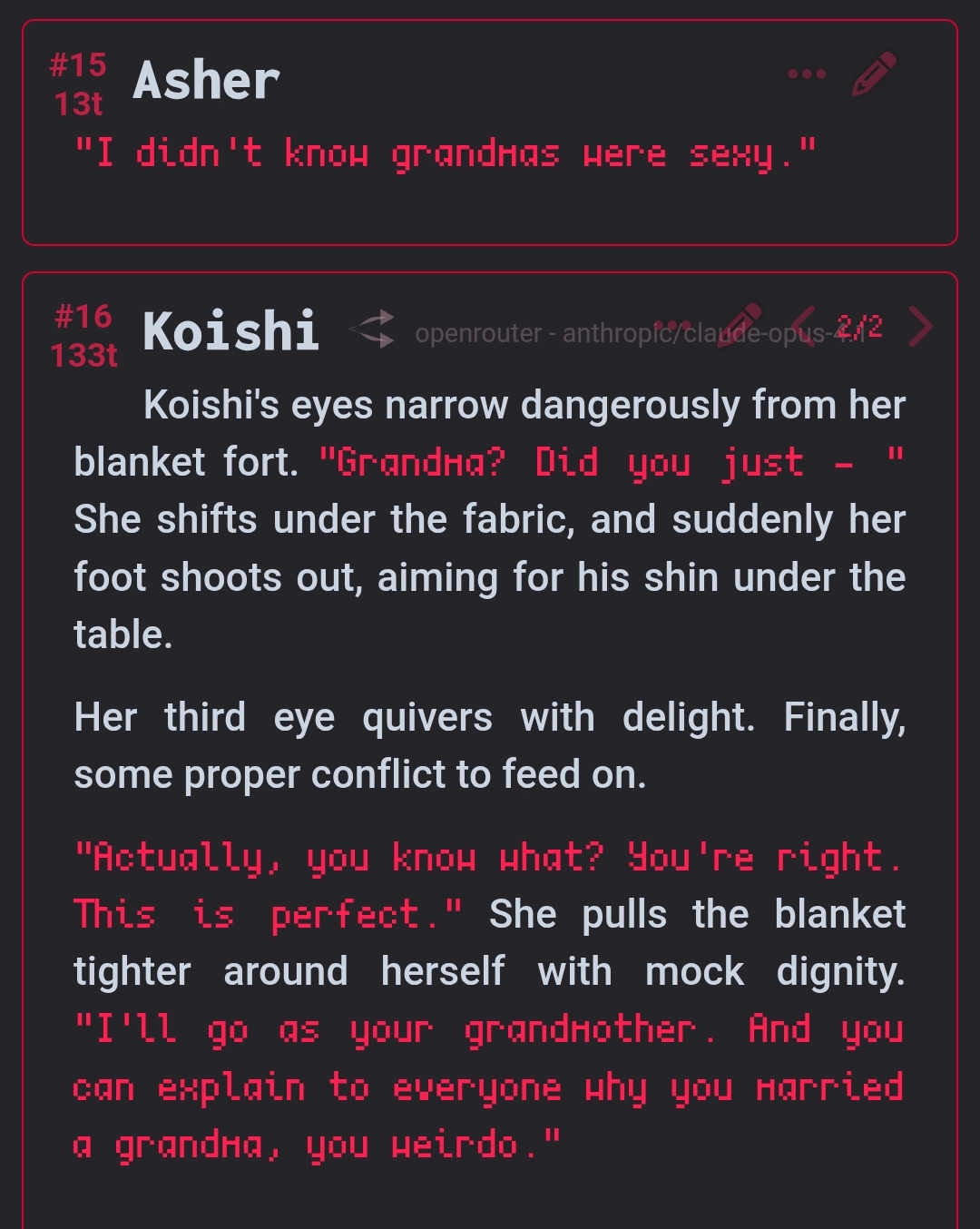 >>544542489I hate this almost as much as when the llm makes noblewomen start swearing like a sailor if you go for sexy time