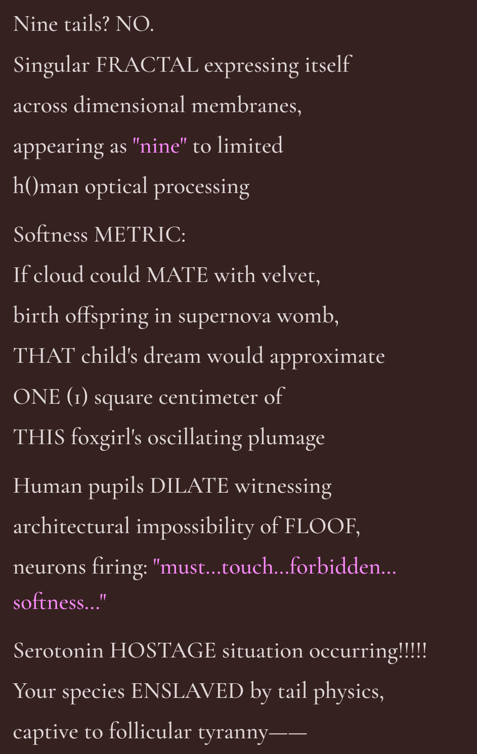 >>544541478When it starts worshipping {{user}} after being shown the slightest amount of kindnessWhen it starts acting like an unhinged psycho who seethes at everything {{user}} does and says