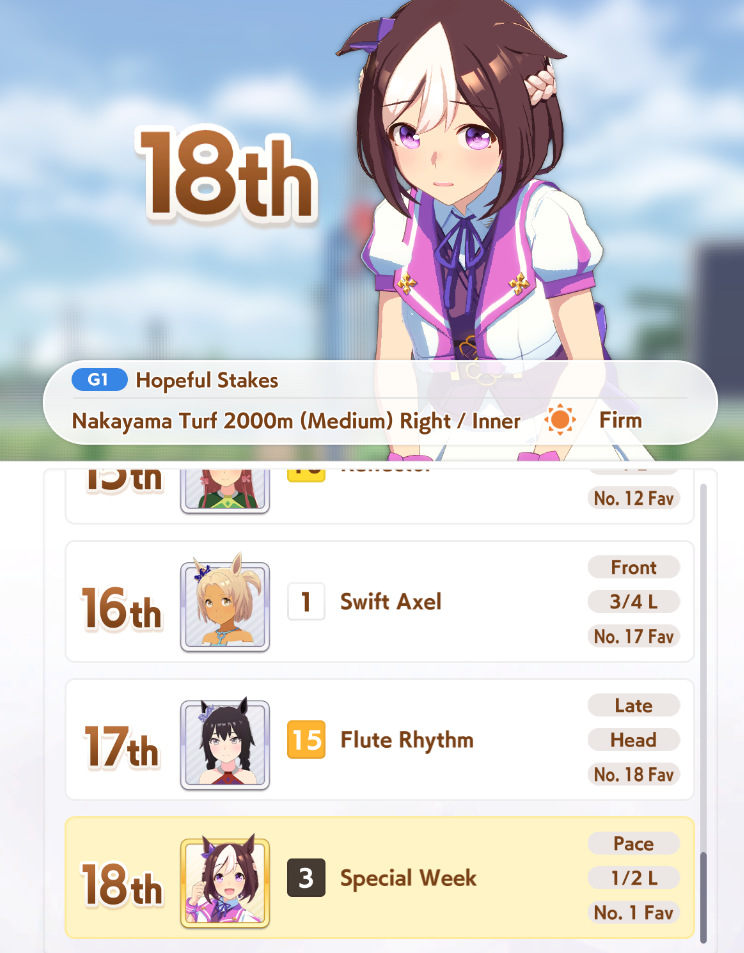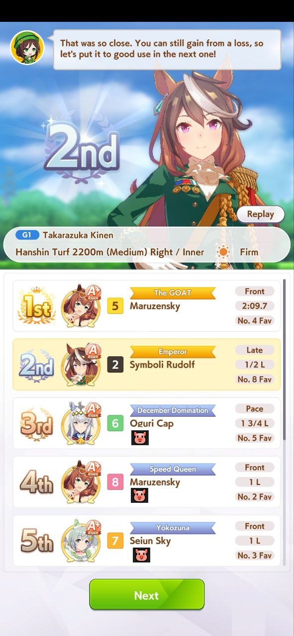 >>544533536>spechud>rudolfNever fucking EVER expect a good start with those(or a good career in general lol)This is the way it goes:1. Get late start2. Get brocked/not enough power to accelerate and overtake/not enough speed to overtake/ran out of stamina to overtake/nobody in front to overtake3. Ult doesn’t proc4. You lose the raceAnd this shit happens a lot, you must constantly juggle them between pace and late depending on your stats and number of front/pace runners in the race