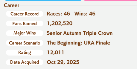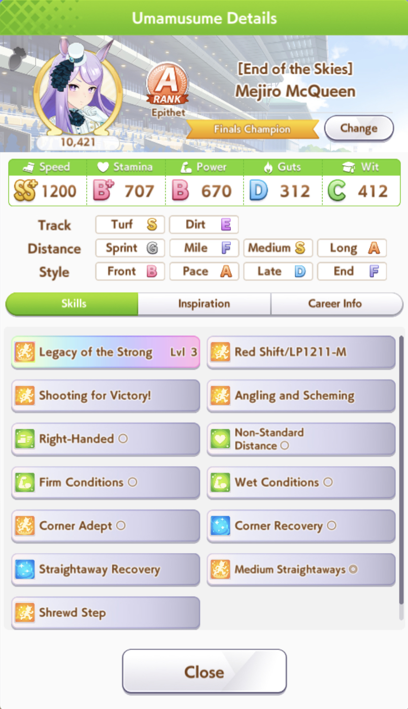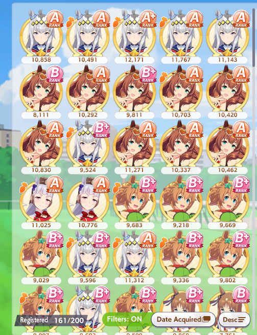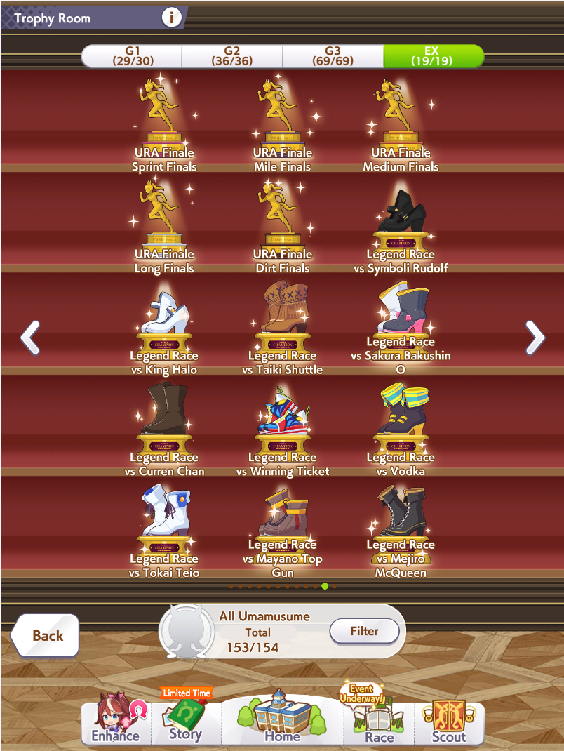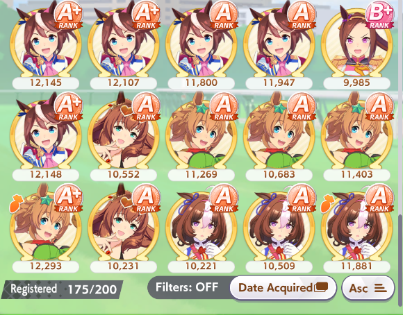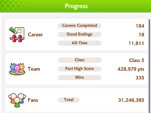 >>544562050Trying to build good legacies, working on CM horses even if I usually just get B finals, filling out the trophy cabinet and chasing events, building team trials teams.The nice secondary benefit to doing all that is that it gets you more carats you can use to pull new umas for new uma career stories.
