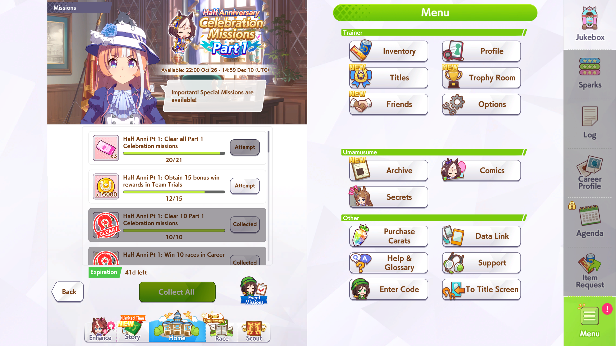 Previous: >>544468660 (Cross-thread)>Global Game NewsCurrent Specials Missions: Half Anniversary Part 1Current Rate Up: Meisho Doto (3*), Special Week (SSR), Tokai Teio (SSR)10/26 - Half Anniversary Part 110/30 - Eishin Flash (3*), Nice Nature (SSR), Tosen Jordan (SR)10/30 - LEO CUP - Hanshin 2200m11/02 - Half Anniversary Part 211/06 - Half Anniversary Part 3>JP Game NewsCurrent Rate Up: Transcend alt (3*), SSR Tokai Teio (Speed), SSR Hoshina Kiyoko (Pal)New Scenario "Yukoma Hot Spring" releasedNew Scenario CM featuring C. Lemaire and Take Yutaka: https://youtu.be/eoKazrX91xwTimeline: https://uma.moe/timeline>IP NewsUmamusume Cinderella Gray 2nd season started weekly airings on 10/5Umamusume 6th Live Event Autumn Leg will be held on 10/18-19Guest Starring:Alexandros, Ooishi Masayoshi (Day 1), Kageyama Hironobu (Day 2)https://umamusume.jp/contents/event/tnf6th-autumn/>Thread Clubshttps://rentry.org/globalclubsumaYou must be E3 (20k points) to join a circle. Apply with /uma/ or /vg/ in your profile or post ID in the thread.>All Guides & Resourceshttps://rentry.org/uma26Game databasehttps://gametora.com/umamusume (Click the gear to switch between JP / global server info)A basic guide for newfagshttps://rentry.org/umaglobalFind networks if your region is blocked from the game or clienthttps://www.umavpn.top/93Seiyuu & Concertshttps://rentry.org/umst/uma/ POG (Paper Owners Game)https://rentry.org/umapog