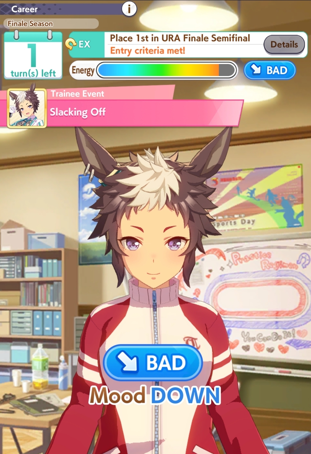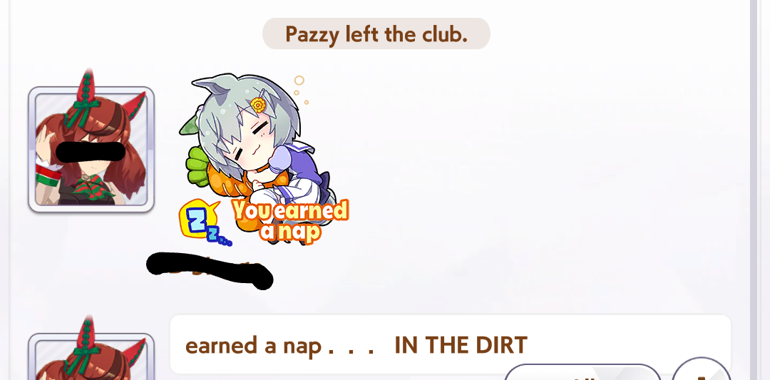 >>544539423I had a funny run almost become legit last night with Summer Spe, because I had a bad turn 1 with one character on each facility, I did recreation and got karaoke. And that whole pre-debut, I got fatty event twice and I'm running Brian who locked in for the speed facility a lot, so I had, like, 400 speed, 350 stamina/power by Hopeless Stakes. This HAS to be it.I think my greed got me because I got acupuncturist, went for winning, failed, *oh well* mood-2, not the end of the world. Then I got 3 sleep deprived no night owl, surprisingly and outside of a 3 character rainbow first summer, I never had more than 2 characters on speed the rest of that year, and everyone decided to fuck off from speed between February and October of Senior Year. I ended with 800 stamina/power, but not even 1k speed, it was a sad turnaround.
