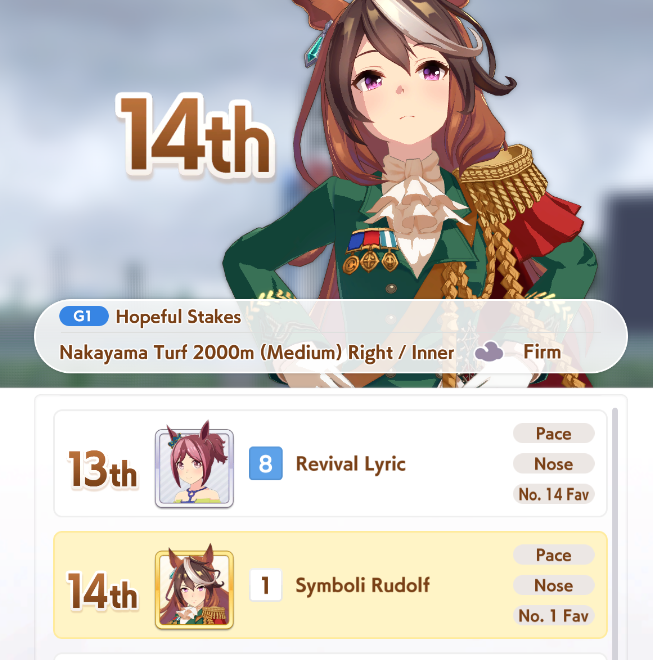 >>544562752Takarazuka kinen sunny firm great mood if finals random if you want a realistic experience WHERE YOUR FUCKING BEAST OF AN ACE GETS POOR 95% OF MATCHES
