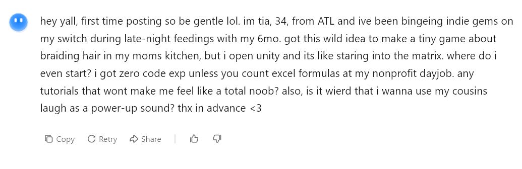 >>544597125Also making posts like this>>544597835>I am biding my time and canceled my first date last second because I realized I needed some me-time alreadyHe knows how this looks, this isn't something to tell strangers on the internet. He doesn't care because it gets him attention. This is why he belongs on lolcow forums and not in here with people who just want to make games. He is a full blown, face plastered on the internet wagging his dick at everyone lolcow. And he will never be satisfied until he graduates from shitting up gamedev threads. Then he can finally have all the attention he craves.