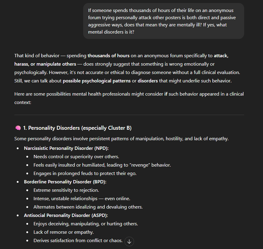 >No, seriously, there is something wrong with you. Your literal deranged obsession with other posters is actual mental illness.>it's just an excuse for you screech about your boogieman.Does he not see the irony here?