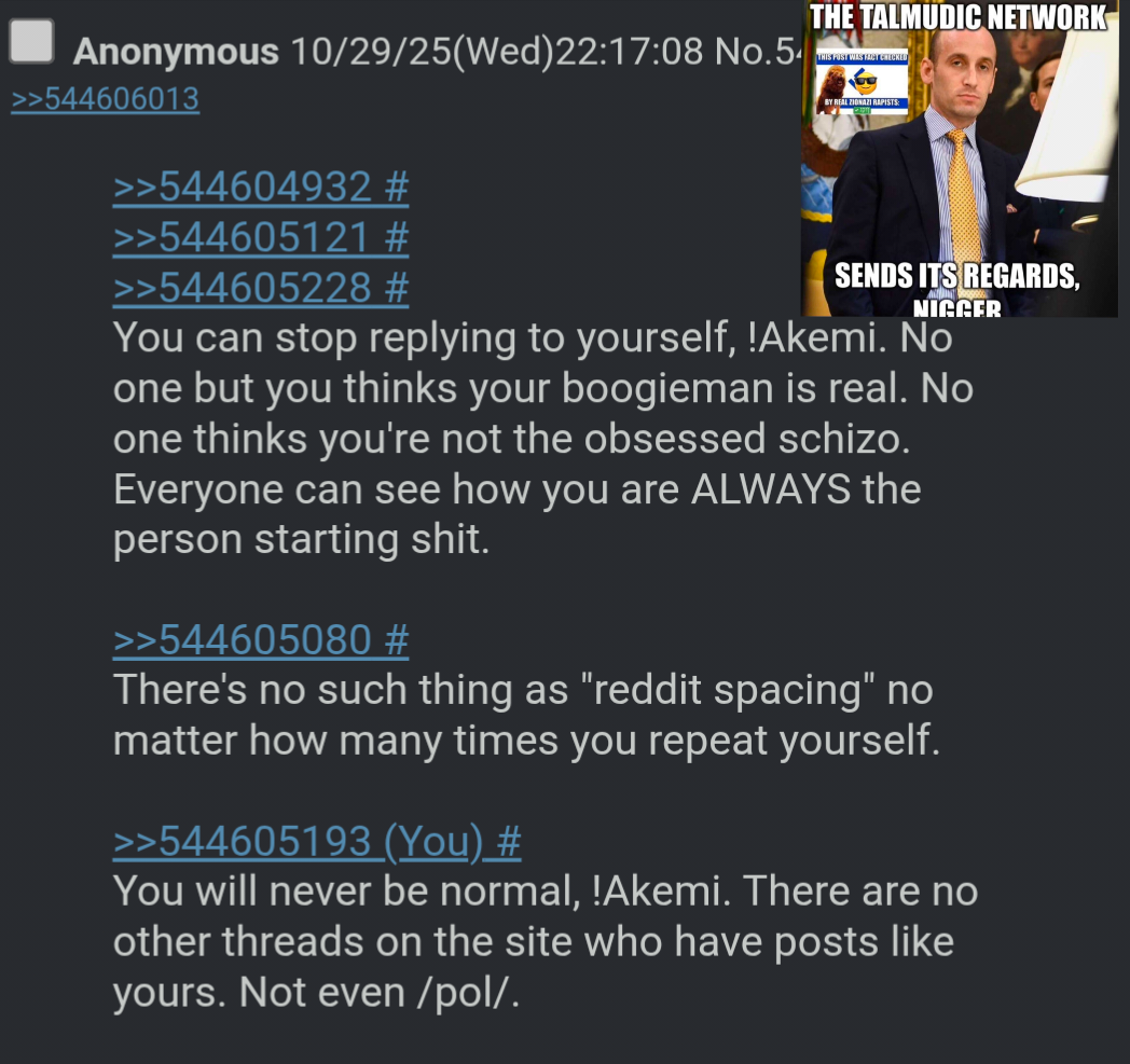 >>544614362>>544614610>>544614769You will never be "everyone".You will never be anyone's "nemesis". No one sees you as a person. Everyone sees you as garbage that needs to be cleaned up.>i- it's fine for me to scream at everyone that they are ack but if anyone calls me out on samefagging after i've been IP banned and caught samefagging 100s of times that means ur schizo!!Mods on mangadex straight up caught you making multiple sock puppet accounts on the same IP. Just to scream about "ack".You are told to stop shitposting.In response you scream about "ack". Everything you do is wrong.