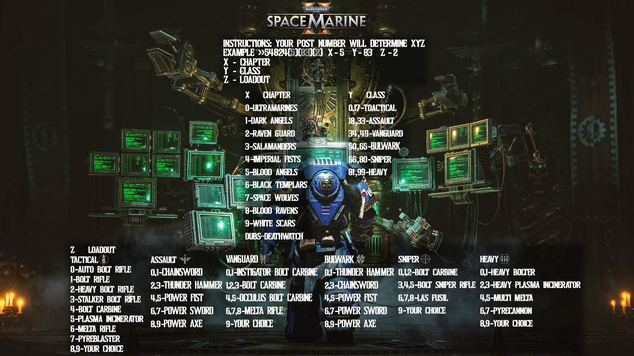 The BEST Legion Edition!>PTS 11.0 patch notes:https://community.focus-entmt.com/focus-entertainment/space-marine-2/blogs/287-pts-patch-notes-11-0?>Update 10.2 patch notes:https://community.focus-entmt.com/focus-entertainment/space-marine-2/blogs/272-hotfix-10-2-patch-notes>September Community updatehttps://community.focus-entmt.com/focus-entertainment/space-marine-2/blogs/278-september-community-update>Year 2 Roadmap:https://i.imgur.com/61HZRF3.jpeg>Where to get the game:https://www.focus-entmt.com/en/games/warhammer-40000-space-marine-2>Lore Stuff:https://1d6chan.miraheze.org/wiki/Main_Pagehttps://wh40k.lexicanum.com/wiki/Main_Page>For jolly cooperation with your battle brothers (Can also post codes for jolly coop/PvP. Edit Squad -> Invite Menu):https://steamcommunity.com/groups/sm2general>Workaround with matchmaking (not finding players, only 2/3):Back out to the main menu and re-enter battle barge.>Datasheet showing hidden difficulty modifiers for each difficulty (for easier damage reference):https://docs.google.com/spreadsheets/u/0/d/1kVvYgDBoAan98W3IjAM6ERdq-QfkCsaVvXKF5g_Q9sU/htmlview>Spreadsheet useful for damage calculation:https://docs.google.com/spreadsheets/d/1HzX5LzOD8NZyOTV-BUyL8kWoLEpt-skM/>Recommended prestige perks (WIP):https://i.imgur.com/oy6eQdx.jpeg>/sm2g/ Dude Wall - Compilation of Dudes:https://dudewall.github.io/dude-wall/>/sm2g/ Phantom Links Chapter Lore:https://rentry.org/ChroniclesofPhantomLinksPreviously on the Battle-barge: >>544565467