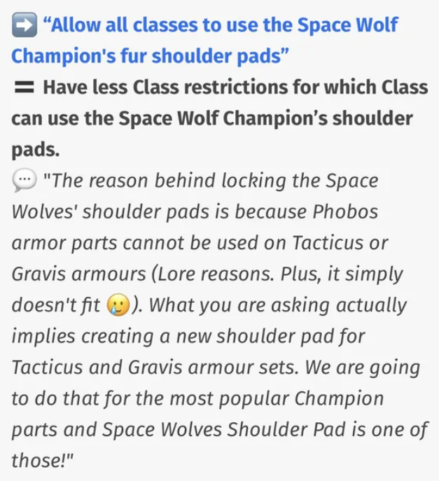 >>544626440Like Anon here >>544624412 said. Camos would be the best idea, but also a lot of tacticool belts, pouches for arms/legs/torso, maybe even pads. There are so few distinct greaves as well that I'm more than sure we'll get those too.Carcharodons are a complete mystery to me in terms of cosmetics, I guess shark themed pauldrons with teeth etc.