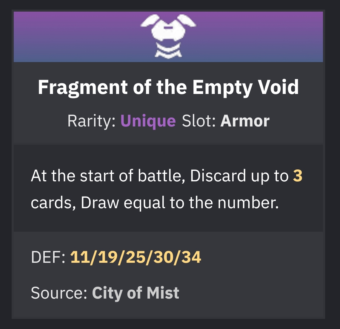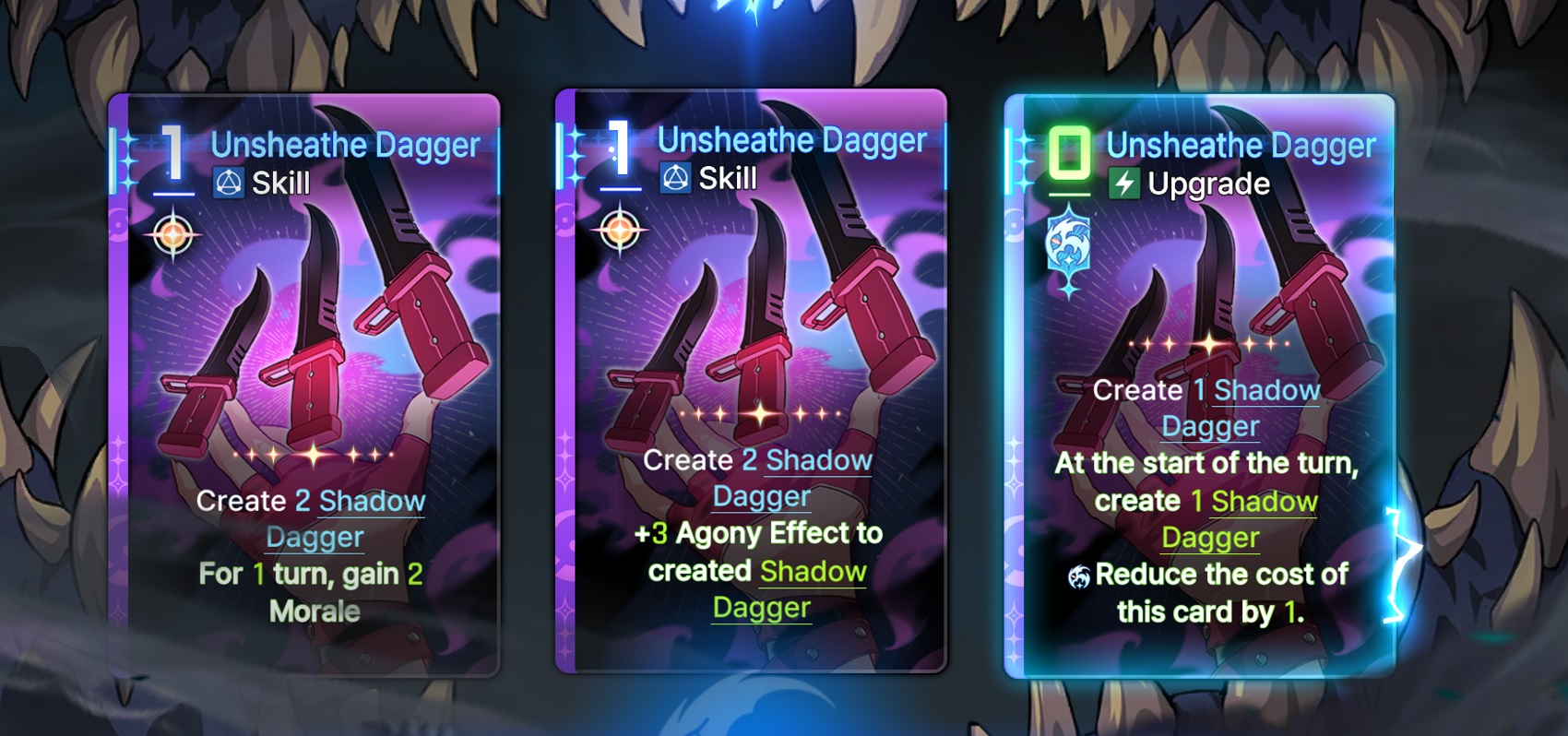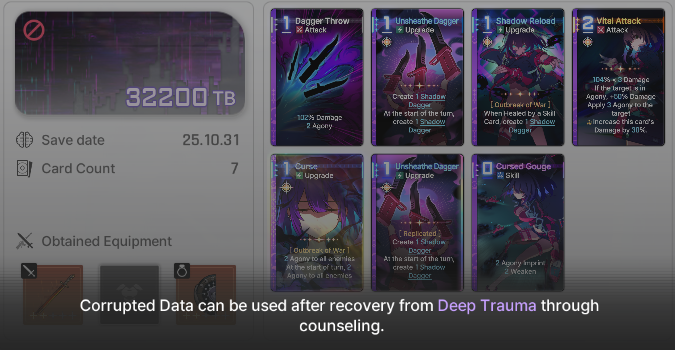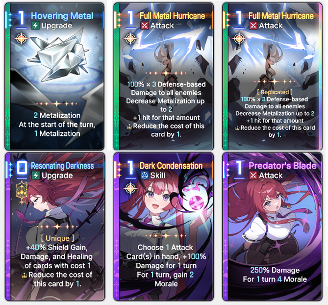 >>544686610technically not true because the "move" keyword can pull things out of the current turn used pile>>544686412cards that fuse together to make new cardscards that steal enemy abilitiesshield-based damagecards that cost egocharacter with an actual mindbreak decktrap cards that get triggered by enemy actionscards that can stun enemies (cancel action)cards that consume buffs/debuffs for extra effects (have a bit of this with Mei Lin, but you could do it with other buffs like Morale or with Agony)