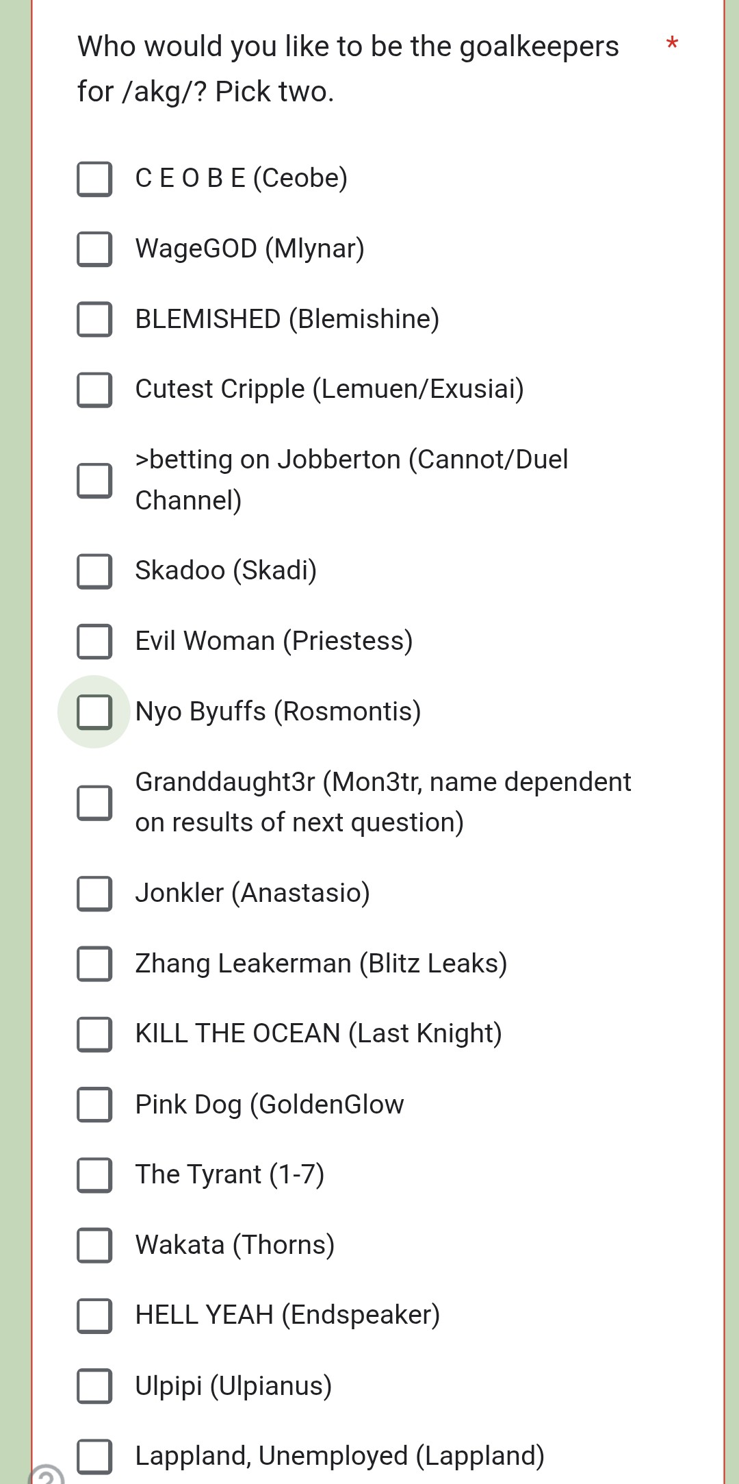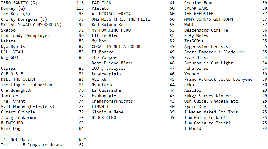 >>544691151I'm just baffled by jonkler making it on. People hardly even cared for him while the event was on and the meme itself disappeared after a week, there's no reason for him to have made the time other than hehe joker joke, which I would expect better of you /akg/.