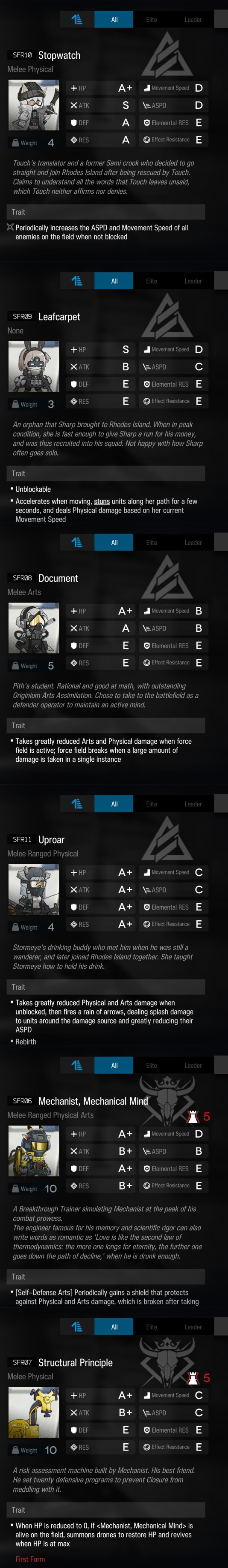 >>544669735>VanguardsCantabileElysiumMaybe Texas if you need a stun.>GuardFuze and Tachanka if you have them.La PlumaLapplandSpecterTequilla>DefenderBasslineLiskarmNearl>SniperAndreana if you have an AH team.Blue PoisonEratoKroos2LunacubPlatinum>CasterAbsintheAmiyaRockrock>MedicAmiyaHoneyberry and Mulberry for elemental heals.PtilopsisSilenceWarfarinWhisperain for stun immune mostly.>SupporterSceneShamare>SpecialistCliffheartFEaterIana and Kazemaru are fun to use.ManticoreMr.NothingProjekt RedTin ManTake this list with a grain of salt since I mainly use 5* and 4* only. A lot of these are replaceable if you have their 6* equivalent.