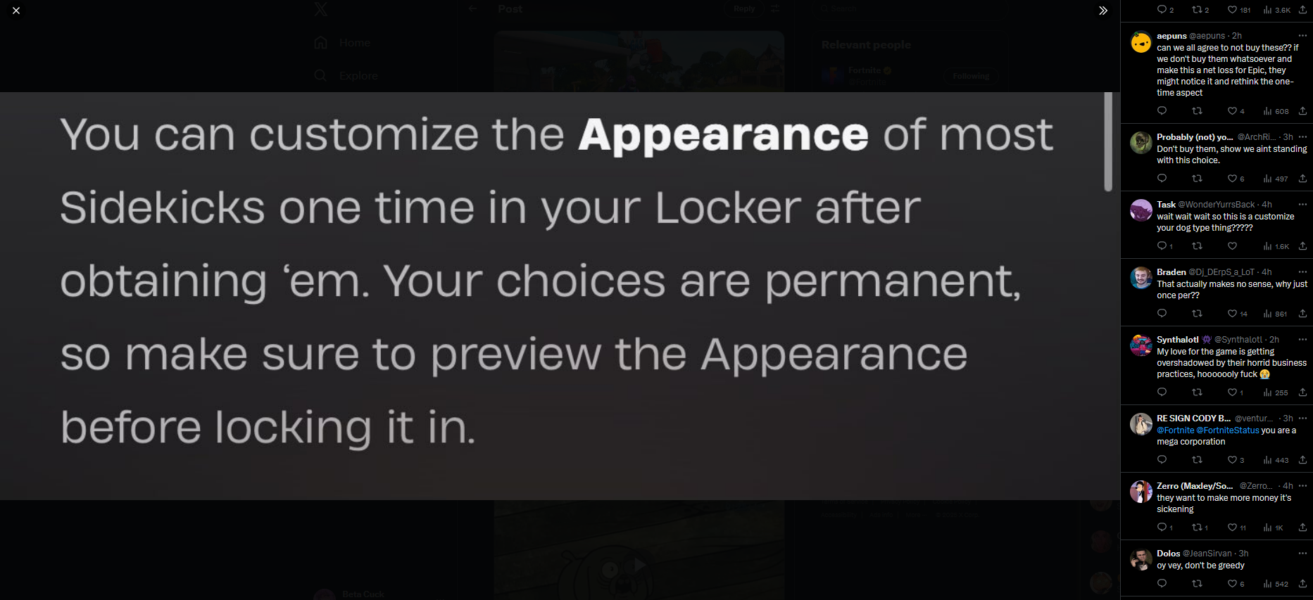 allow me to spin a yarn>fortnite is in full collab mode>reaching out to a bunch of different IPs, some say yes because theyre already shaped like people>a concerning number say no because the skin either has to deform to the human skeleton or shoot guns>when offered a backbling negotiations fall apart because backblings are sold too cheaply or dont advertise the IP enough>suddenly an idea is hatched: sidekicks>can be any size, dont have to shoot guns, can be sold for more vbucks due to their higher quality and can properly embody the host IP through custom animations and cosmetics>but compfags whine that they give you away in a fight>alright, lets make them only visible to the player>a new issue: a cosmetic thats only visible to the player loses a lot of its purpose, and pricing such a cosmetic accordingly would likely make them cost about the same as a backbling, which creates a licensing cost problem again>underpaid epic jeet is banging his dot against the table trying to think of what to do>his high caste brain figures it out>sell the sidekick at the reduced cost, but only allow the styles to be bought individually>children who can barely afford it will buy one, and fat cats who buy everything will spend untold amounts to have every type of ear or color available, bringing in just enough money to turn a profit overallhonestly, if this was the way things went, it makes a lot more sense