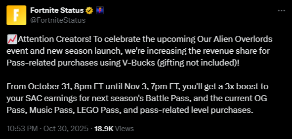 >Fortnitemares 2025 Gameplay Trailerhttps://www.youtube.com/watch?v=AlABOZhCCqU >Fortnitemares 2025 Cinematic Shorthttps://www.youtube.com/watch?v=ieVR7iSGXDs>Fortnite Battle Royale Chapter 6 Season 4: Shock 'N Awesome | Launch Trailerhttps://www.youtube.com/watch?v=yGqbypEMcVA >Bad Bugs vs Power Rangers in Fortnite BR: Shock ‘N Awesome | Live Action Trailerhttps://www.youtube.com/watch?v=7ZIbokU9tRg >Bad Bugs Bite the Bullet in Fortnite Battle Royale: Shock ‘N Awesome!https://www.fortnite.com/news/bad-bugs-bite-the-bullet-in-fortnite-battle-royale-shock-n-awesome>Quests, stats, shophttps://fortnite.gghttps://fortnite.gg/statshttps://fortnite.gg/shophttps://www.fortnite.com/item-shop>LEGO XP AFK Strategyhttps://pastebin.com/YdrVy46s>Season XP Leveling Pacehttps://www.fortnitexp.net/>Mission Alerts for StWhttps://freethevbucks.com/timed-missions/https://fortnitedb.com/>Introducing Fortnite Sidekickshttps://www.fortnite.com/news/introducing-fortnite-sidekicks>Fortnitemares 2025: A Terrifying New Cast of Horror Iconshttps://www.fortnite.com/news/fortnitemares-2025-a-terrifying-new-cast-of-horror-icons>Fortnite’s Mixtape Music Pass Brings 10 New Jam Tracks!https://www.fortnite.com/news/fortnites-mixtape-music-pass-brings-10-new-jam-tracks>Bringing Hero Classes to Odysseyhttps://www.fortnite.com/news/were-merging-lego-fortnite-expeditions-with-odyssey-by-bringing-hero-classes-to-odyssey>Fortnite Ballistic v37.10 Adds the Veiled Precision SMG, Deployable Wall Gadget, and Morehttps://www.fortnite.com/news/fortnite-ballistic-v37-10-adds-the-veiled-precision-smg-deployable-wall-gadget-and-more>Fortnite Crew October 2025 - Hana Parkhttps://www.fortnite.com/fortnite-crew-subscriptionPrevious:>>544620038