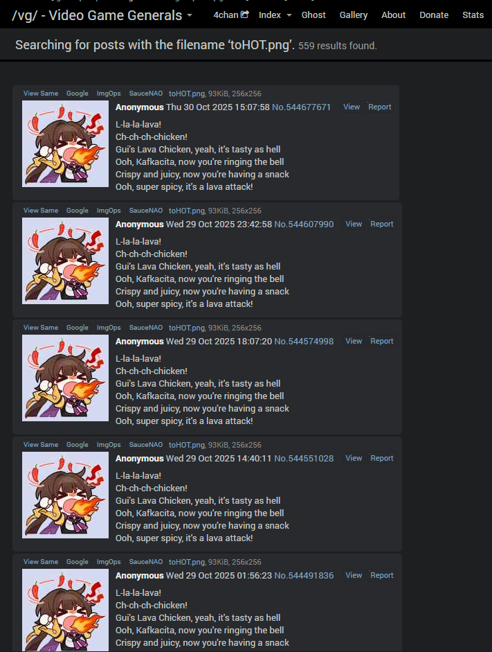 The first occurrence was a self-reply chain on June 4th:https://arch.b4k.dev/vg/thread/526220497/#526224082https://arch.b4k.dev/vg/thread/526220497/#526224162https://arch.b4k.dev/vg/thread/526220497/#526224307https://arch.b4k.dev/vg/thread/526220497/#526224450https://arch.b4k.dev/vg/thread/526220497/#526224569https://arch.b4k.dev/vg/thread/526220497/#526224683You will note that each post is spaced at least 1 minute apart, indicating that they have a 4chan Pass. June 4th is also a full two months after the initial release of the Minecraft movie, thus when combined with being a Pass-holder, one can posit that the poster is not younger than their mid-20s. This is because they did not see the Minecraft movie on release, or if they did then the movie did not make such an impression on them to start posting Lava Chicken until two months later.A Lava Chicken post has never been deleted by jannies in isolation, and since beginning on June 4th there has been at least 1 Lava Chicken post a day to the current date, with no 3-day gaps indicating a ban. We can combine this with their Pass-holder status to assume that they are a poster in good standing and do not get banned nor ban evade (otherwise their evasion would be discovered quickly).As we all know, Lava Chicken is typically posted at the very start of a thread, so analyzing the distribution of post times will not give much benefit (as /hsrg/ slows to a crawl in SEA / early EU time and new threads are typically not made during those hours). However we also know that Lava Chicken is not ALWAYS posted at the beginning of a thread, in fact sometimes it is posted hundreds of replies in. It's also been observed that they have backup images on hand on occasions that someone else snipes toHOT.png before them. This indicates that the poster is human and not a bot.