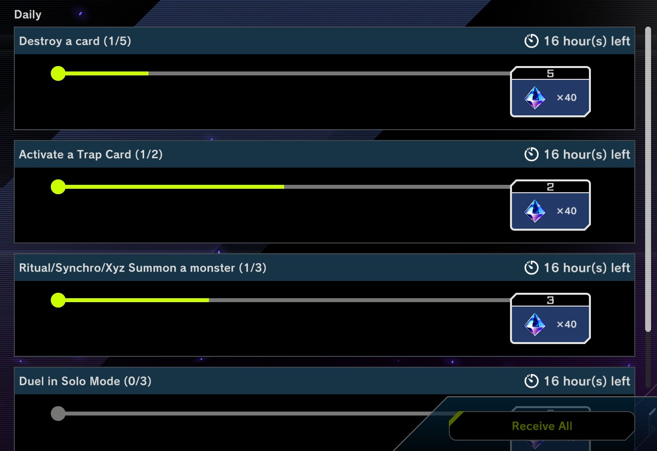 >>544718176You can't have duplicate missions so if you have those missions in your list then you won't get them again. So just don't claim them when you finish them and you won't get them again that month. Surely you'll use Imperm enough over 1 month to complete that mission once.Also the solo mode mission can just be done in one of the tutorials. Either the megalith tutorial which just makes you do one summon then attack, or duel re-something 1 which just has you set a monster and end your turn. Those are the fastest.