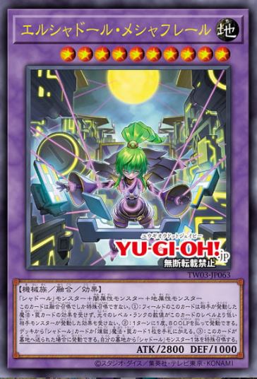 >>544720986 El Shaddoll MeshaflareLevel 10 EARTH Machine Fusion Effect Monster2800 ATK / 1000 DEFMaterials: 1 "Shaddoll" monster + 1 DARK monster + 1 EARTH monsterMust be Fusion Summoned.(1) This card is unaffected by Spell/Trap effects and the activated effects of your opponent's monsters with a lower original Level/Rank than this card.(2) Once per turn: You can pay 800 LP; add 1 "Shaddoll" card or 1 "Void" Spell/Trap from your Deck to your hand.(3) If this card is sent to the GY: You can Special Summon 1 "Shaddoll" monster from your GY.