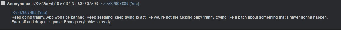 >they actually banned ApoFuck this clown game lol. Shit is fucking dead