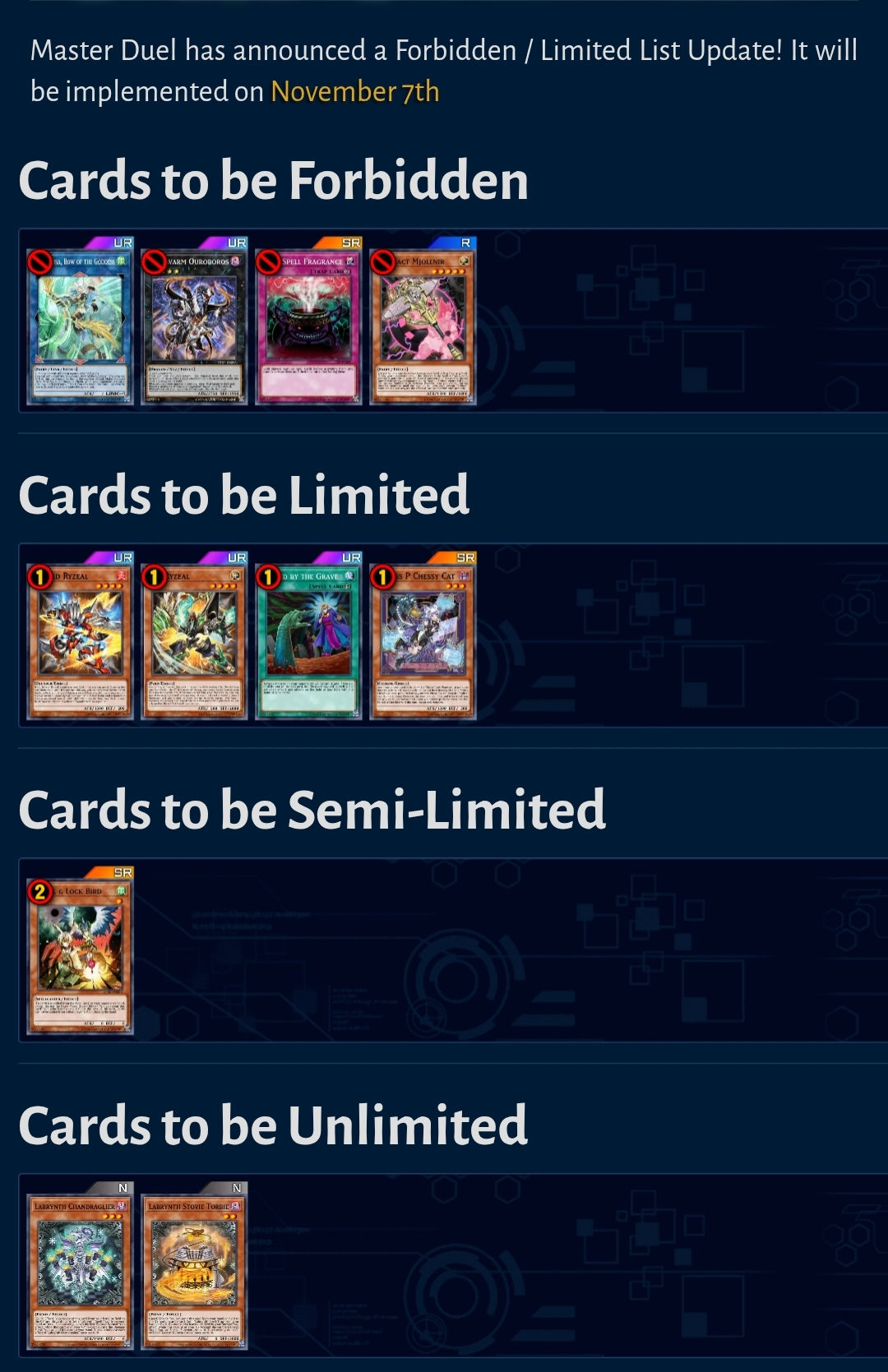 >>544742732>Droll to 2 is a bit out of left field, and they usually doesn't hit card that's effective against current meta because they need to phase them out soon.Knowing Komoney I think it's just for Mitsubishi while it's in the shop and Sky Striker or White Forest for the next pack. TCGtroons clearly had influence on this list with all their "Konami listened" comments.