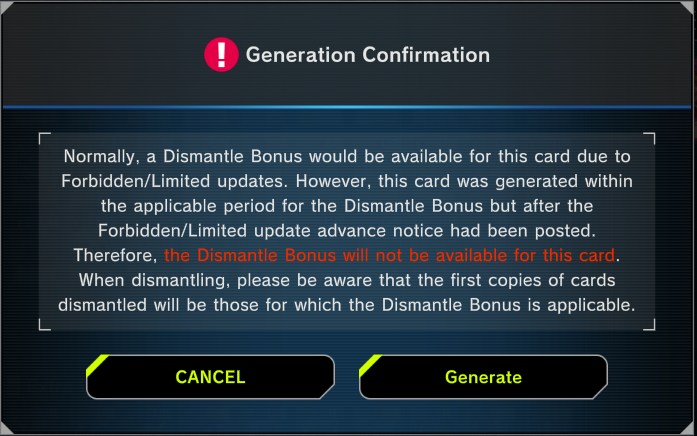 >>544768052You need to wait for the banlist to go in effect. The game displays a dismantling bonus when you are about to dismantle the card if the bonus is active.