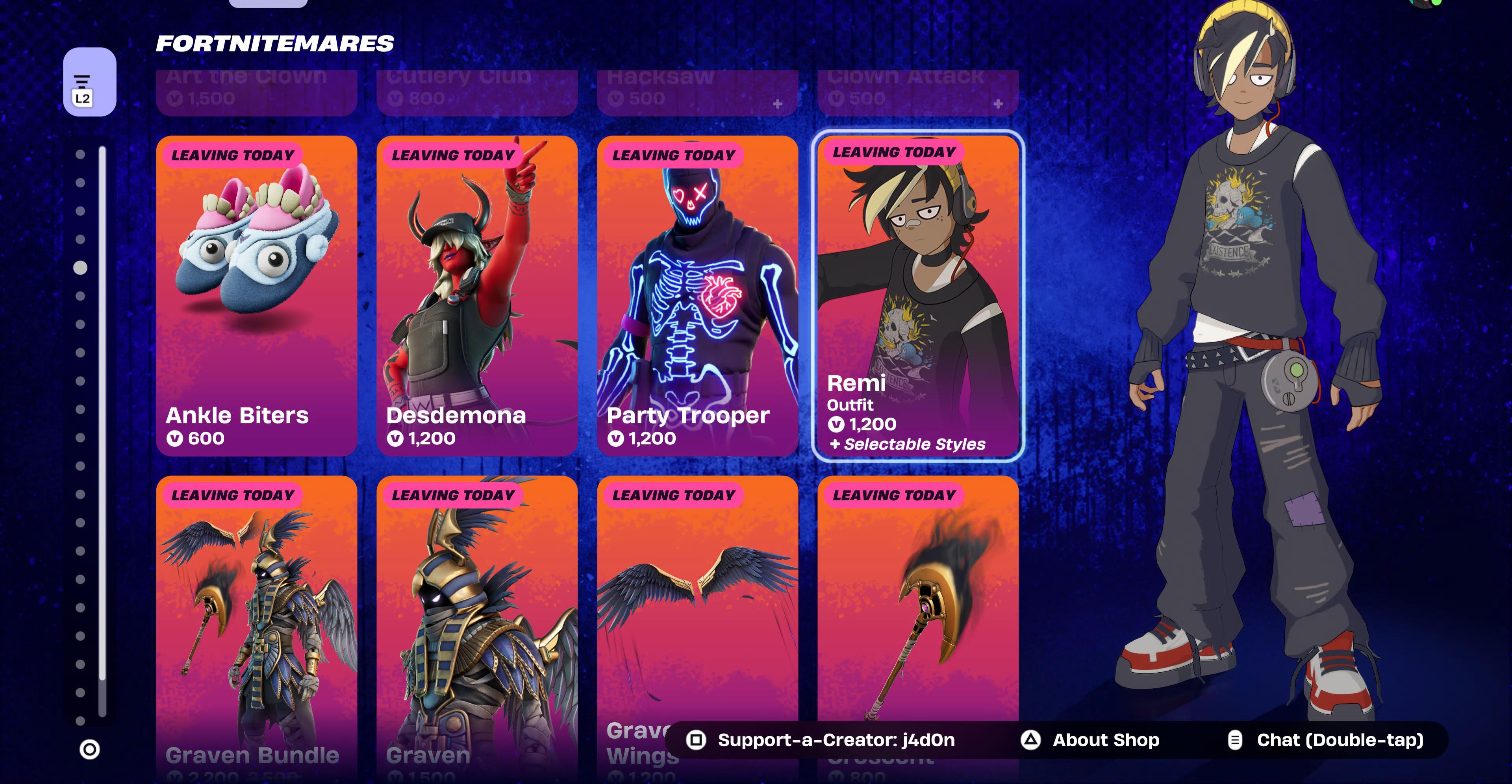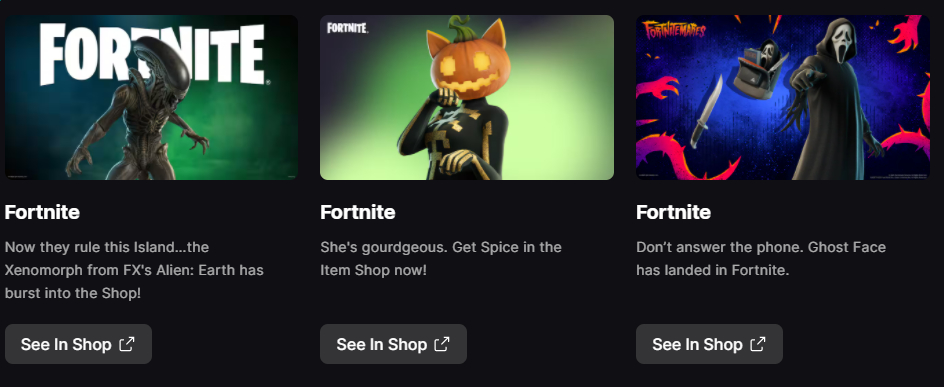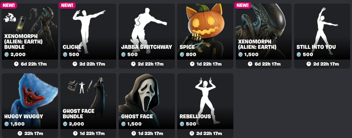 theres gonna be a lot of halloween collabs and emotes that just don't return due to limited shop space and non-renewed contracts this year huh. we have one day left. its so stupid that the absolute slop "victory vibes' and "battle ready" randomized tabs were clogging up the shop all month instead of various fortnitemares tabs. whoever is in charge of the shop rotation sucks balls, if its even a person and not an AI algorithm.